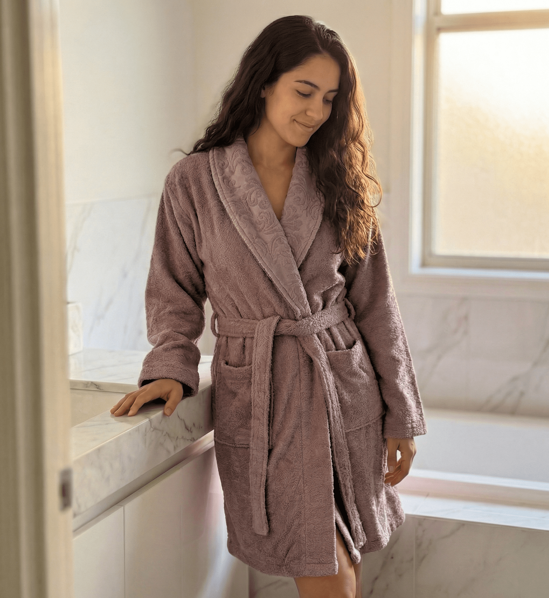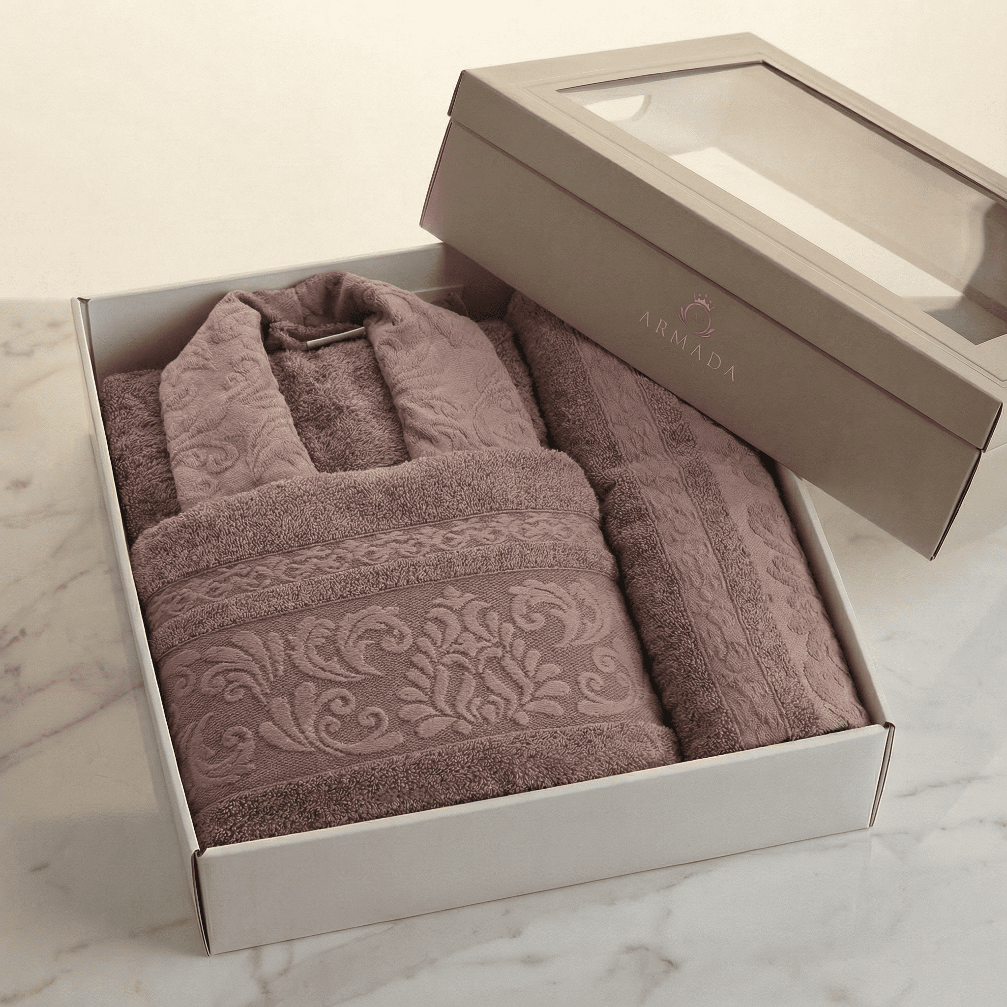 Халатът е с универсален размер, подходящ за S и M, с удобна кройка, колан за пристягане и функционални джобове. Яката е с релефен жакардов десен, който придава елегантен акцент. Кърпите са в същия стил с изискано изтъкан орнамент, създавайки напълно завършен и хармоничен комплект.