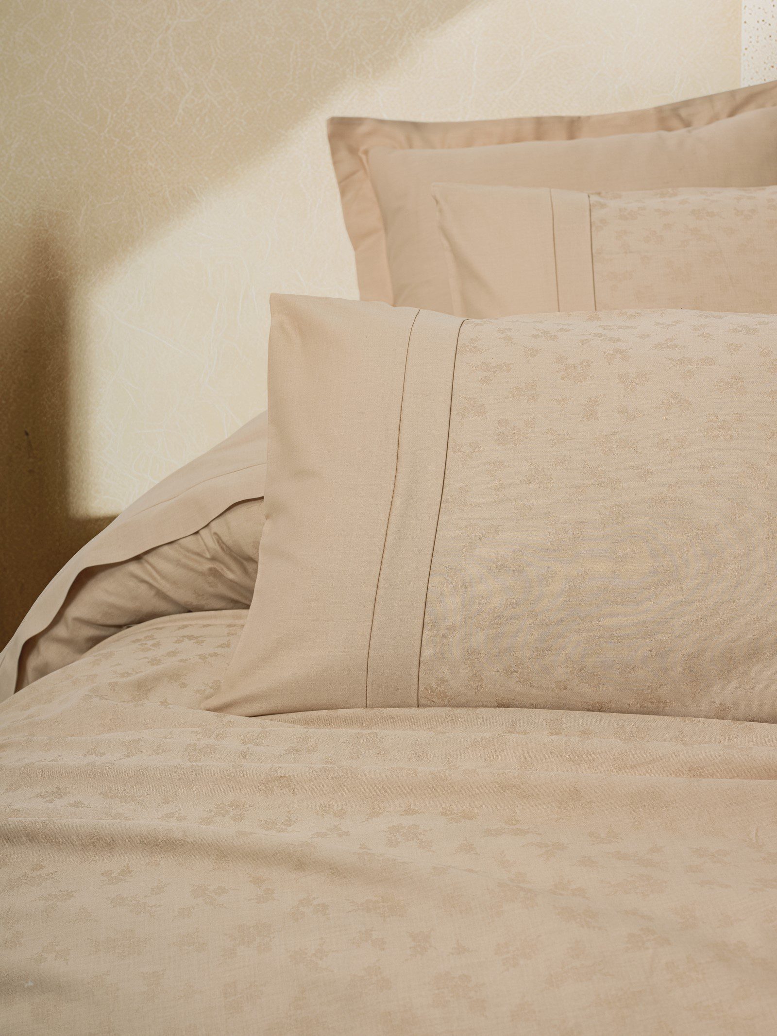 Cotton Box Florita Beige е жакарден сатенен спален комплект от 100% памук, който съчетава нежен флорален релефен дизайн, високо качество на тъканта и изключително приятно усещане при допир, подходящ за елегантна и спокойна спалня.