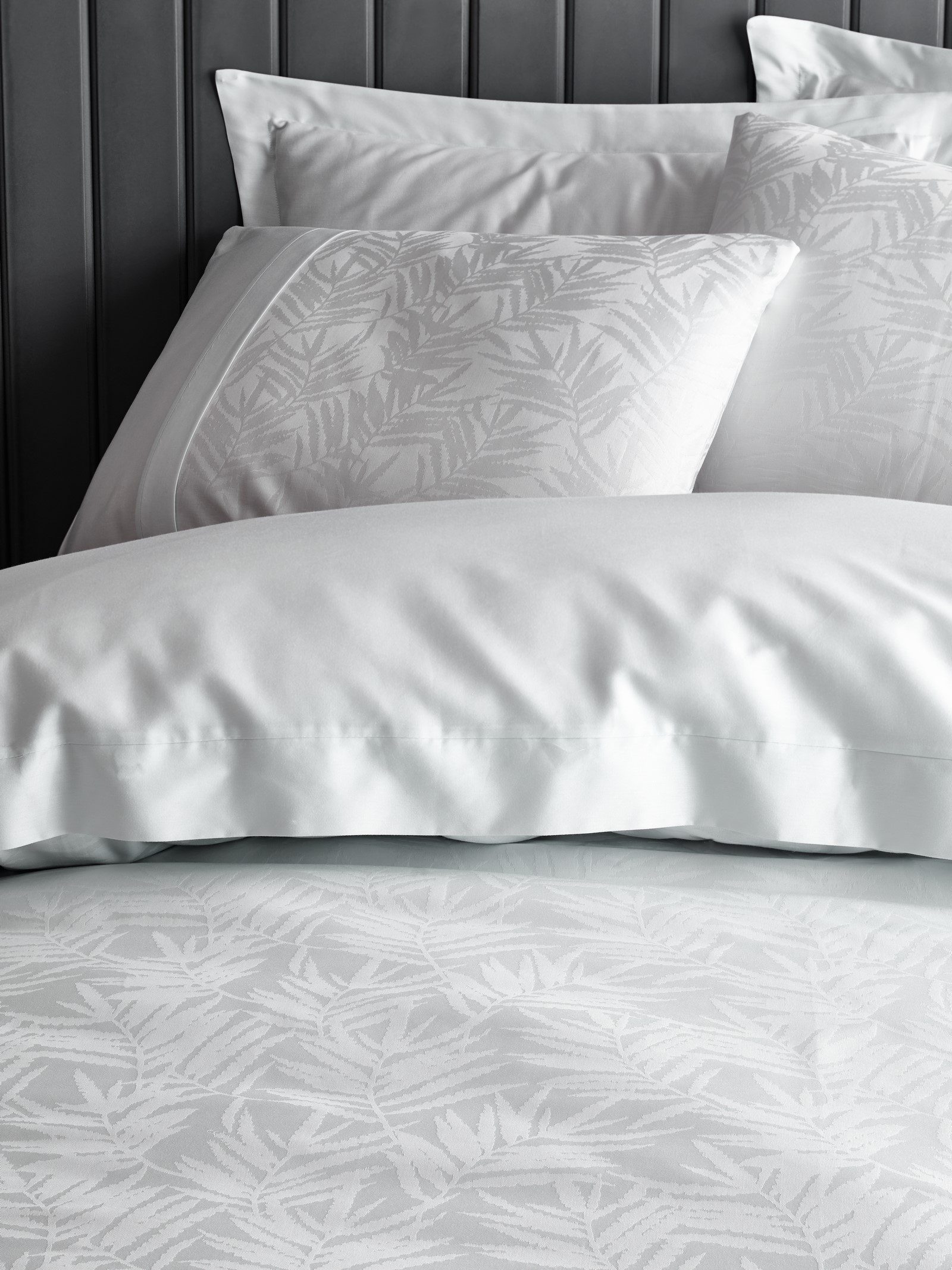 Моделът е двулицев – пликът и калъфките са с жакардов листен мотив, а чаршафът е изчистен, което балансира дизайна и позволява лесно комбиниране с други текстили.