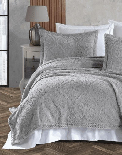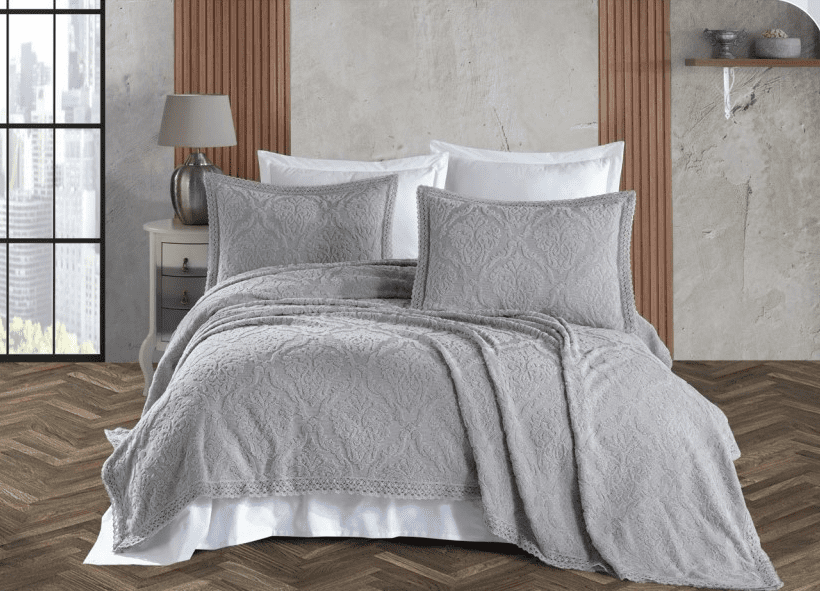 Покривалото е изработено в елегантен светло сив цвят, който създава усещане за чистота, ред и модерен лукс. Десенът е изключително фин и релефен – жакардов орнамент с флорално-барокови мотиви, които придават дълбочина и текстура на материята. Ръбовете са красиво завършени с декоративен кант, подчертаващ изискаността на модела.