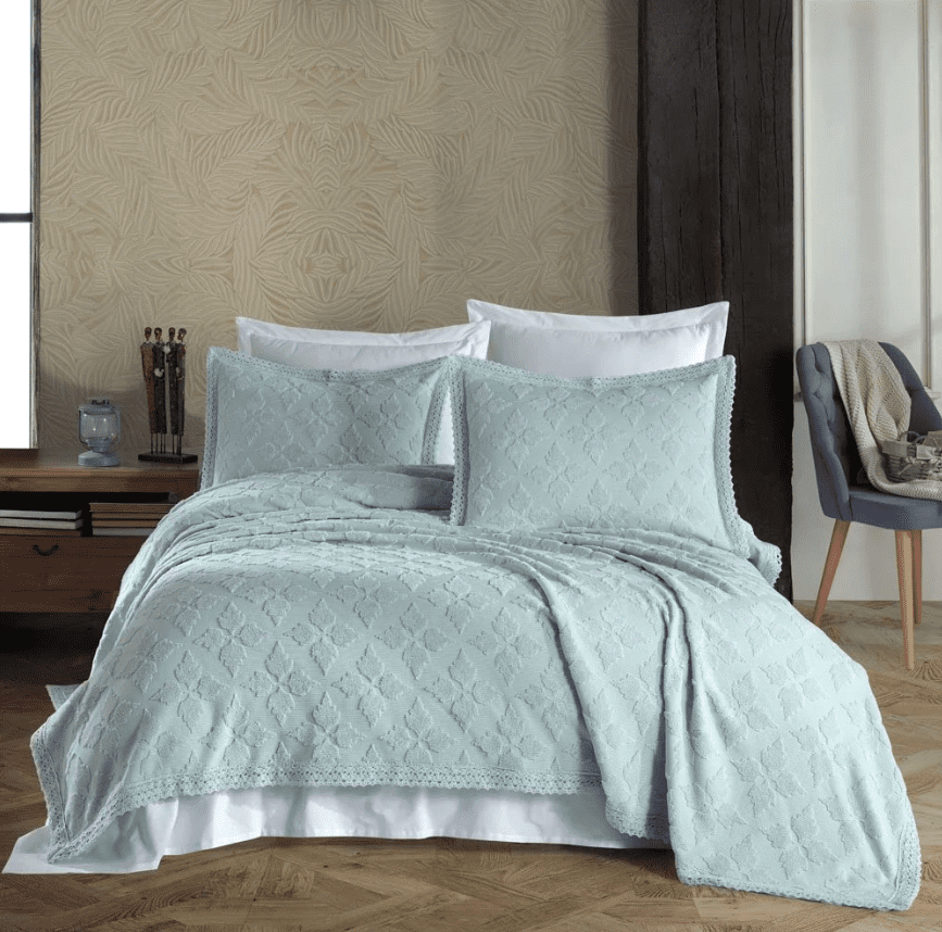 - Покривало с дантела и релефна текстура – добавя елегантност и стил към всяко легло.
