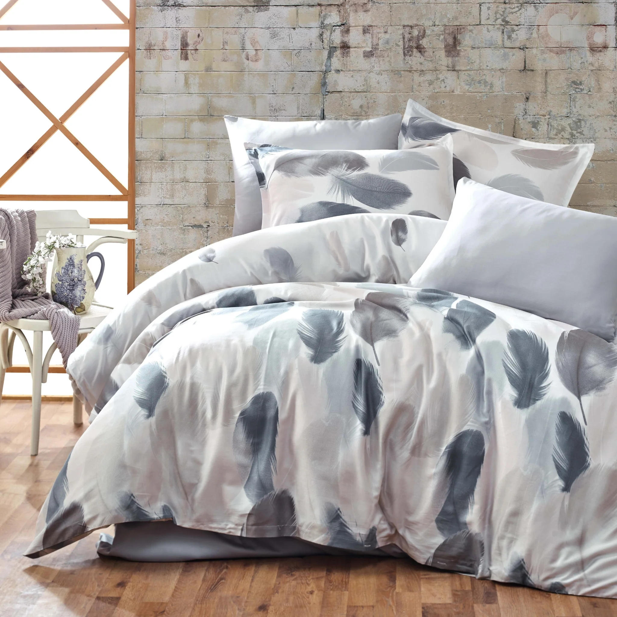 Десенът е вдъхновен от лекотата на перата – фини и ефирни форми, разпръснати върху нежен светъл фон. Цветовата палитра комбинира нюанси на бяло, сиво, графит и меко бежово, което придава усещане за спокойствие, чистота и визуален баланс. Мотивът е модерен, ненатрапчив и създава релаксираща атмосфера, подходяща както за основна спалня, така и за гостна стая или ваканционен дом.