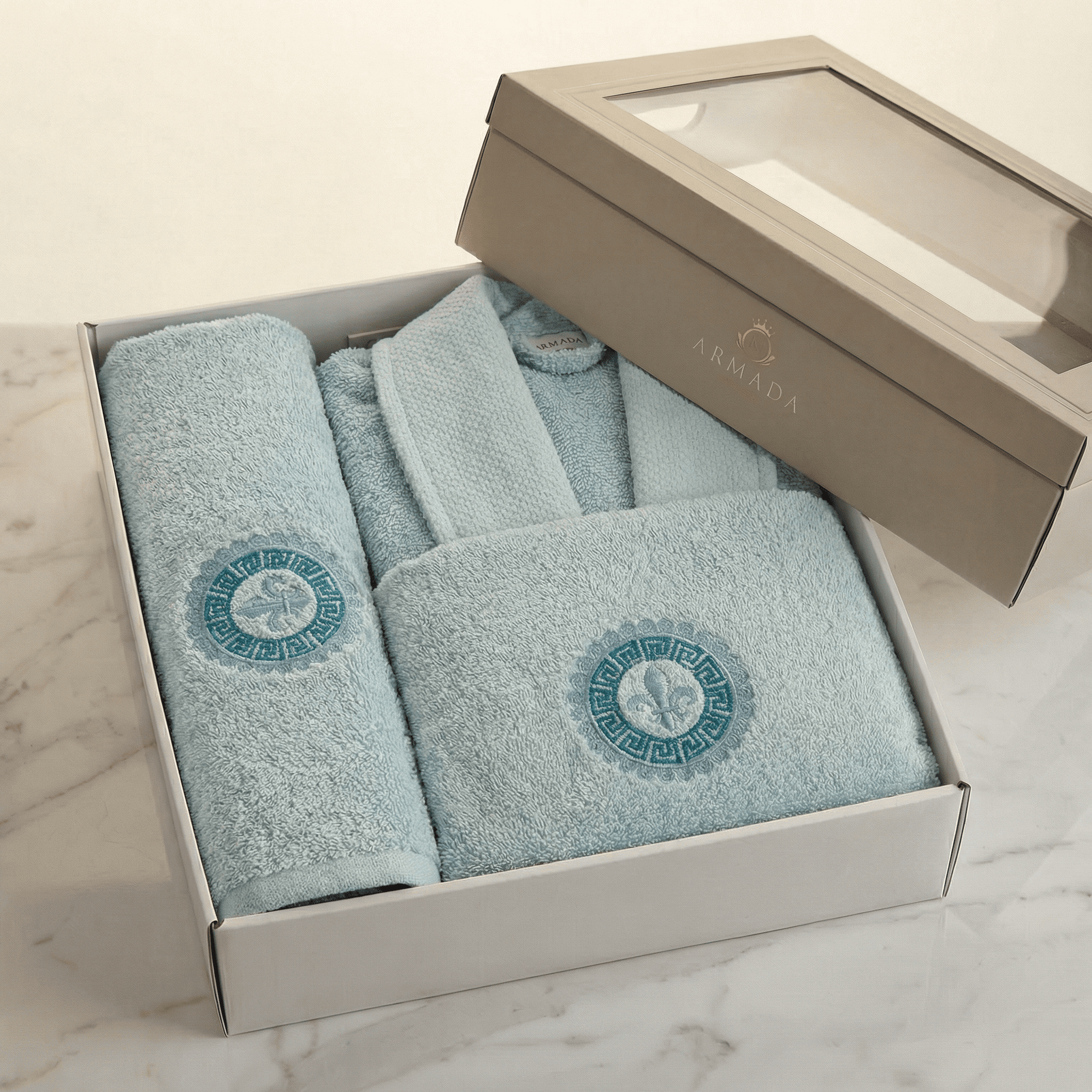 Халатът е с удобна кройка, колан за регулиране и практични джобове, а кърпите допълват визията с елегантна бродерия и плътна текстура.