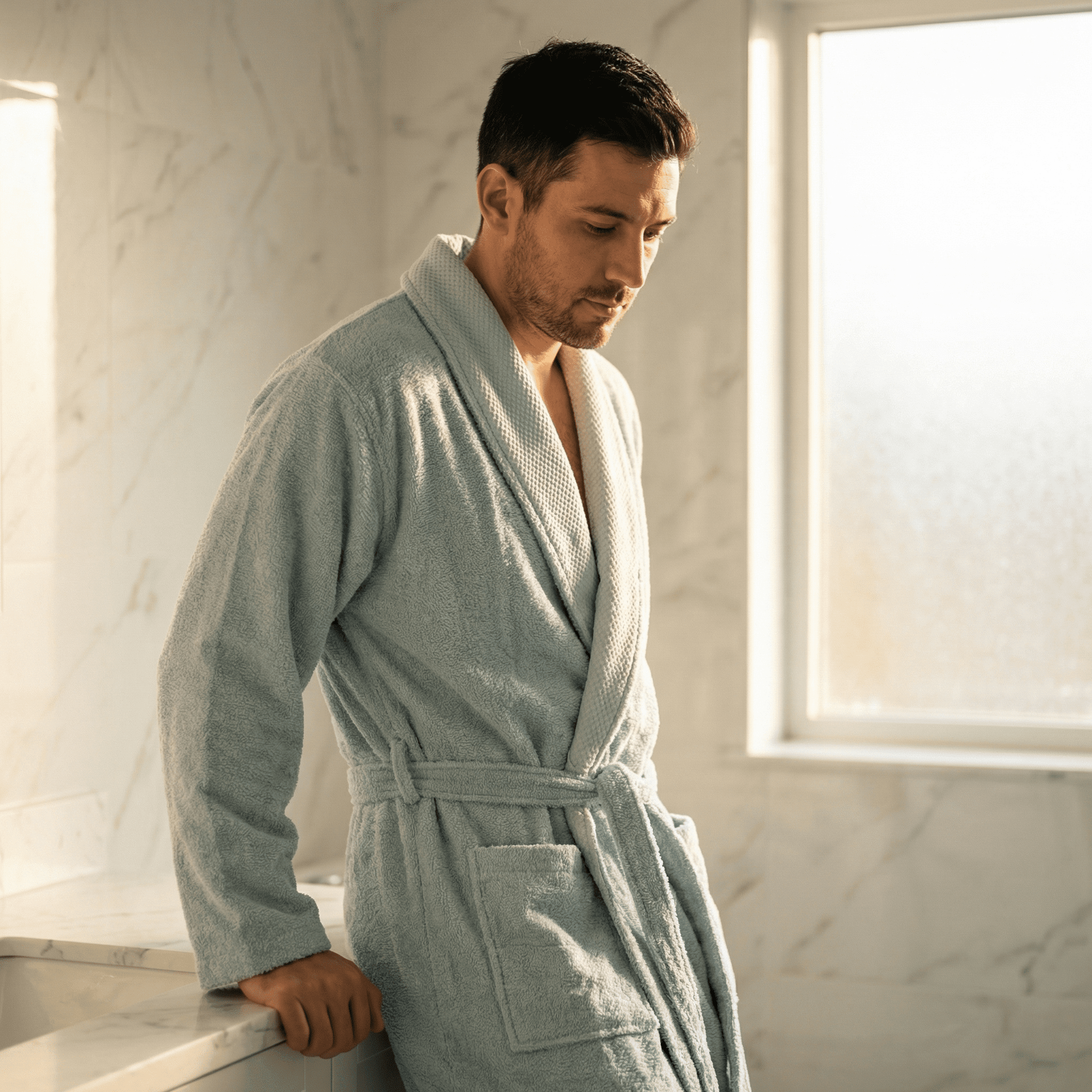 Стилен и завършен комплект за баня в нежен светлосин цвят, съчетаващ комфорт, функционалност и елегантна визия. Създаден за хора, които ценят мекотата на естествените материи и изчистения дизайн в дома.