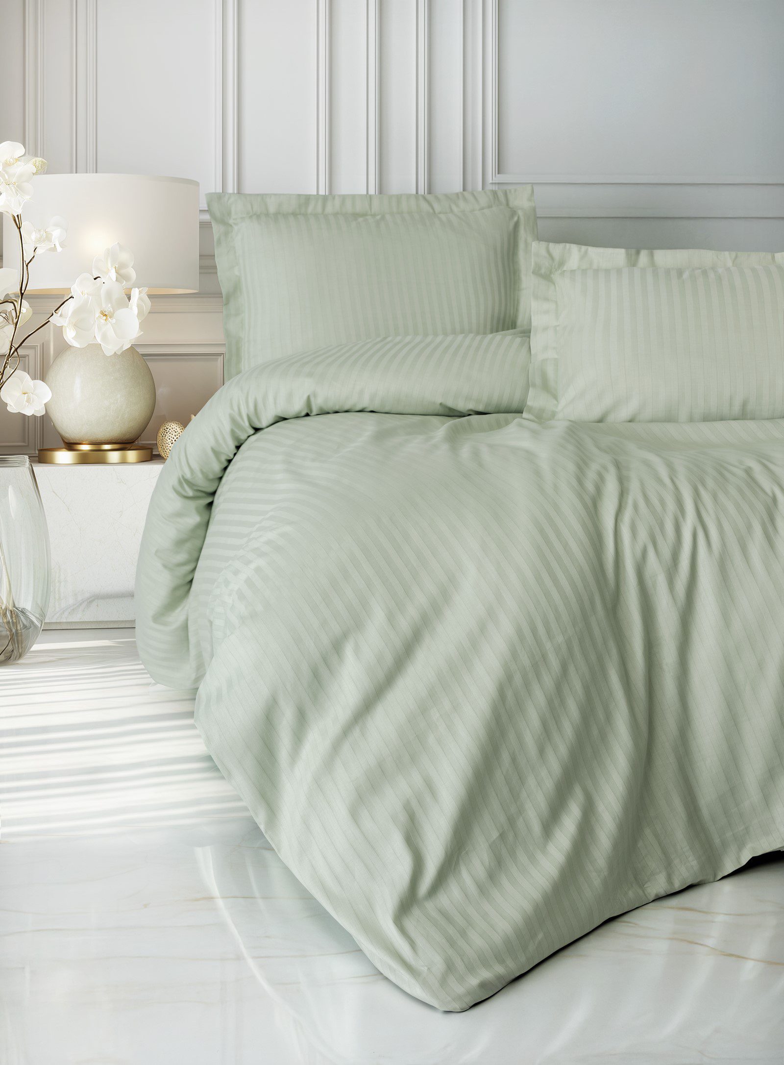 Фината сатенена ивица придава дълбочина и изискан характер на дизайна, без да натоварва интериора. Този дискретен райе ефект отразява светлината меко и придава луксозен завършек, типичен за висок клас хотелски спални.