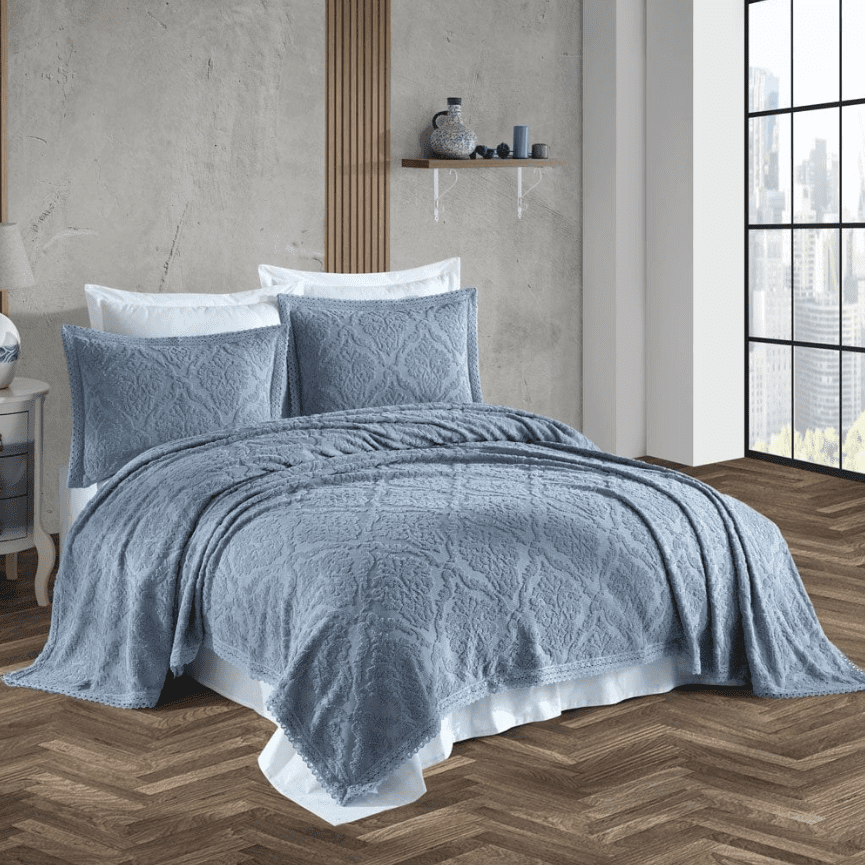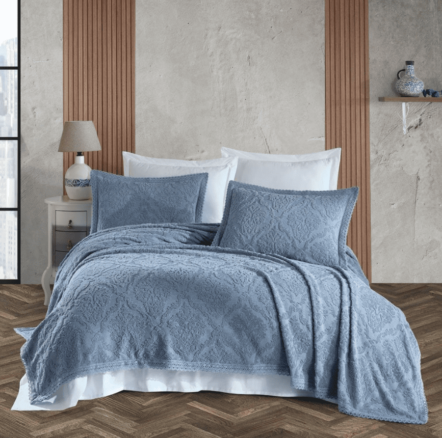 Мекото синьо в комбинация с релефен флорален десен и дантелен кант придава на спалнята изтънчен, но отпускащ вид – идеален за модерни и класически интериори.