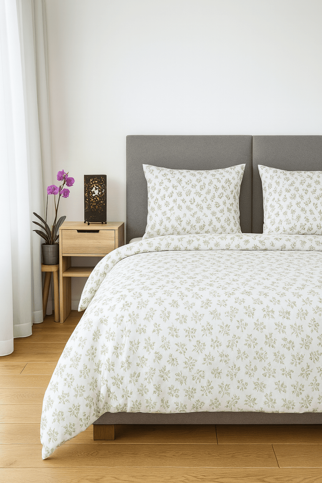 Десенът е изчистен и балансиран – дребни ментово-зелени цветчета, равномерно разпределени върху снежнобял фон. Подходящ за интериори в сканди, натурален или провансалски стил, този комплект внася усещане за лекота, свежест и ежедневен уют.