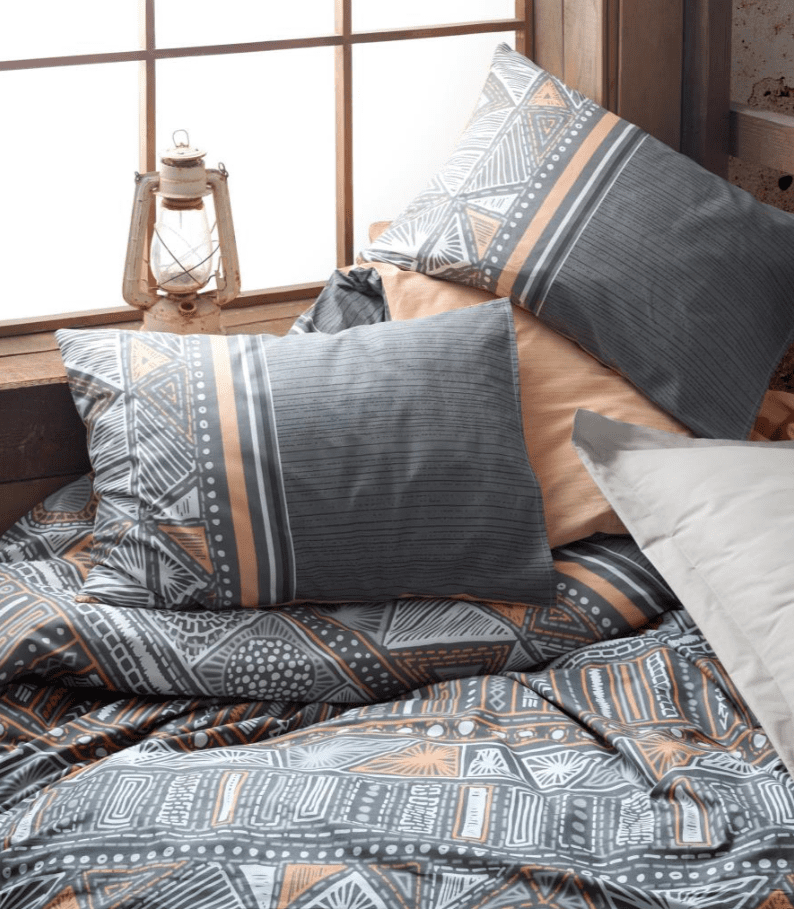 Моделът „Adiel“ на Cotton Box впечатлява със съвременен етно дизайн в сиво, графитено и оранжево. Геометричните мотиви и декоративните линии внасят динамика и артистичен дух, комбинирани с изчистена едноцветна част в сиво. Цветовата палитра създава усещане за уют и топлина, като едновременно подчертава модерния стил на интериора.