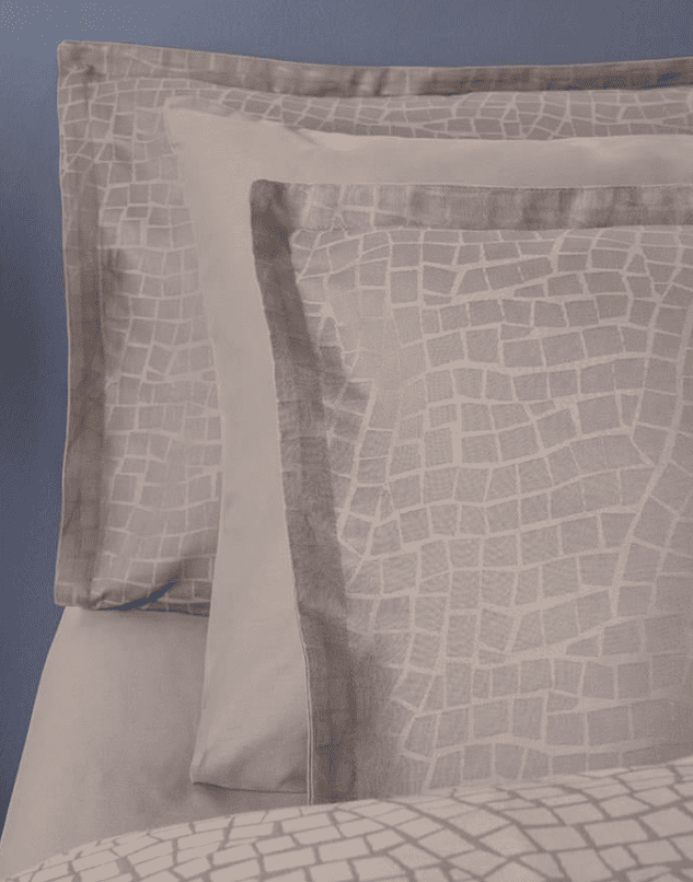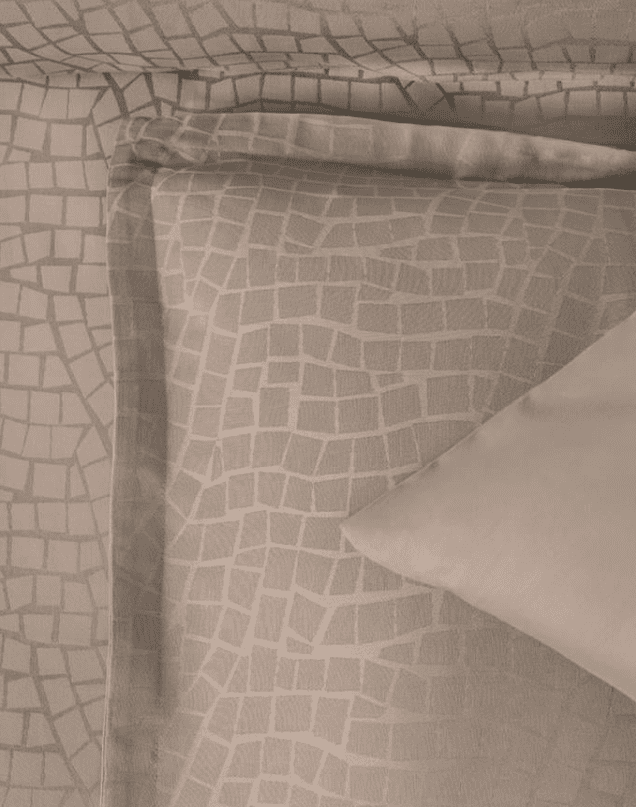 Фин жакардов десен с абстрактна, мозаечна структура, наподобяваща естествени каменни форми. Орнаментът е изтъкан в самата материя, без контрастен печат, което придава дълбочина, релеф и усещане за премиум изработка. Десенът е равномерен, спокоен и ненатрапчив.