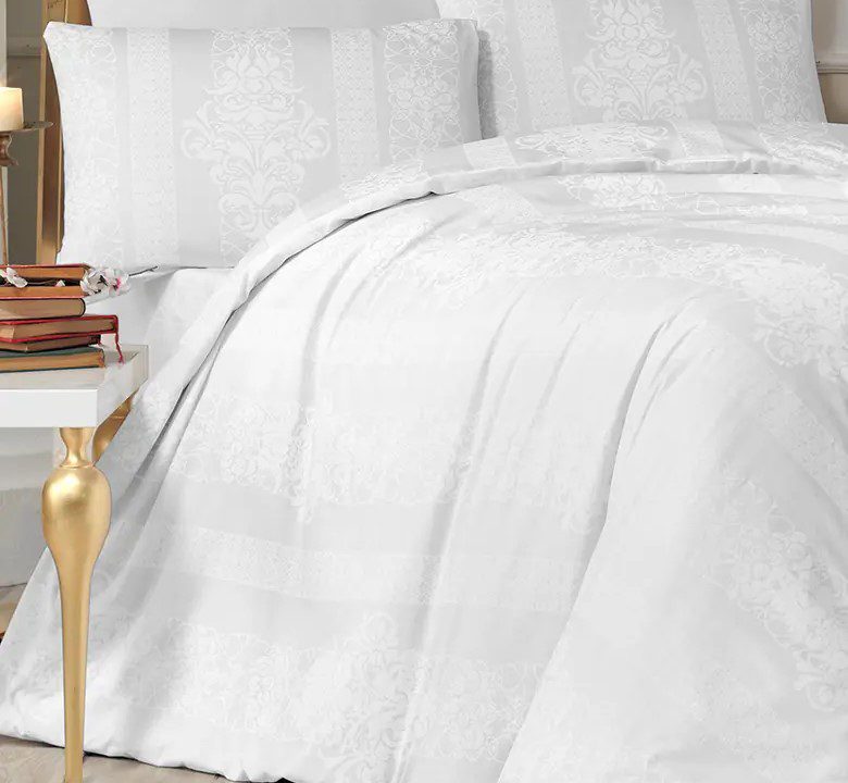 Изцяло в бяло, с леки нюанси на слонова кост и светъл перлен отблясък, които се открояват благодарение на жакардовата текстура. Липсата на силни цветови контрасти подчертава чистотата и усещането за свежест и простор.