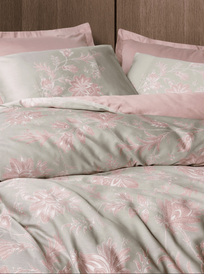 Основният фон е в деликатен кремаво-сив нюанс, допълнен от изящен флорален десен в розово-пудрени тонове. Декоративната изработка създава усещане за дълбочина и изтънченост, а сатенената текстура отразява светлината по елегантен начин, превръщайки спалнята в истински оазис на спокойствието.