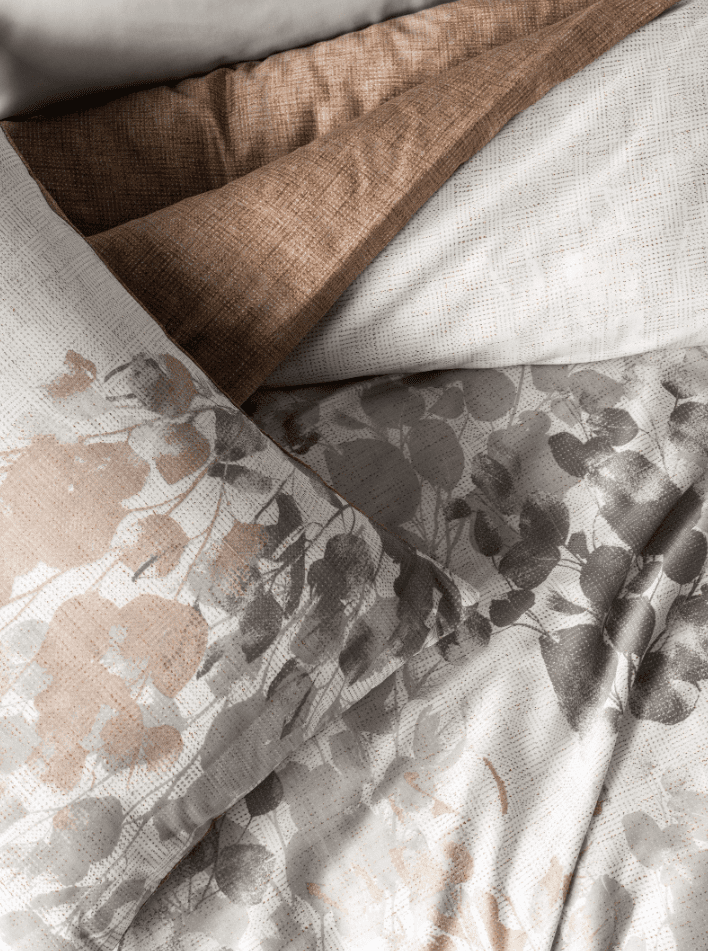 Комплектът е в мека комбинация от светлосиво и бежово, с акцент от флорални мотиви в нежни кафяви и графитени нюанси. Дизайнът е елегантен и дискретен, съчетаващ натурални тонове с деликатна текстура, която придава усещане за топлина и финес.