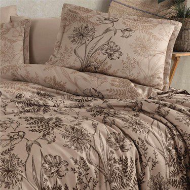 Флоралният десен в бежово-кафява гама съчетава модерна елегантност и природна нежност. Той е универсален и лесен за комбиниране с интериор в скандинавски, минималистичен или натурален стил. Комплектът създава спокойна атмосфера и визуален баланс, превръщайки спалнята в истинско място за релакс.