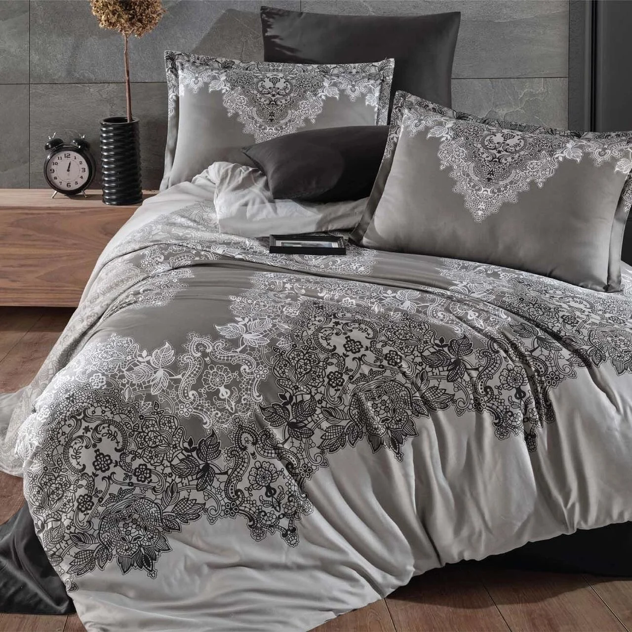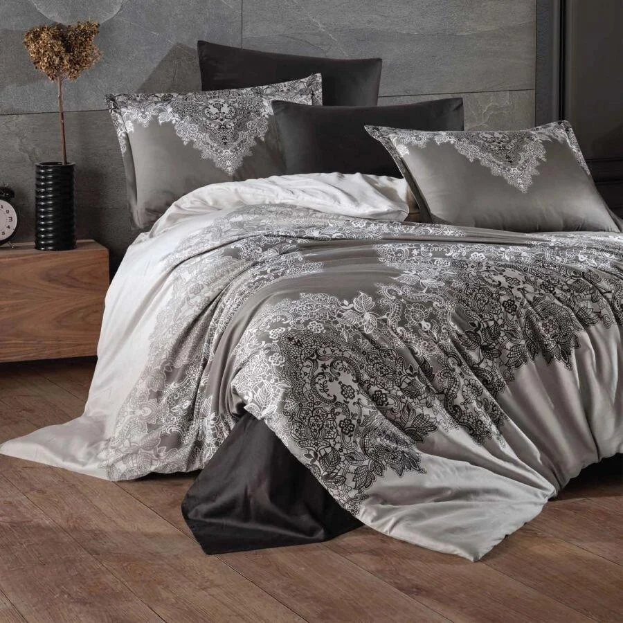 Комбинацията от тъмно, светло и орнамент прави комплекта подходящ за модерни интериори, индустриален стил, минимализъм и по-луксозни, тъмни спални.
