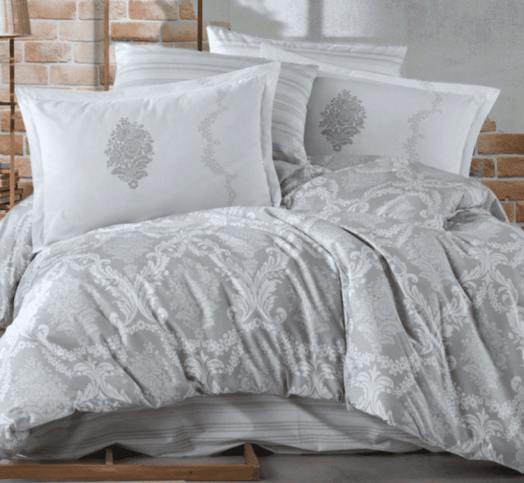 Комплектът е в елегантна комбинация от светлосиво и бяло. Дизайнът е вдъхновен от класическите дамаски орнаменти, които покриват плика и долната част в изискано светлосиво-бяло преливане. Калъфките са акцентирани с изчистени декоративни мотиви в центъра, което придава луксозен завършек.