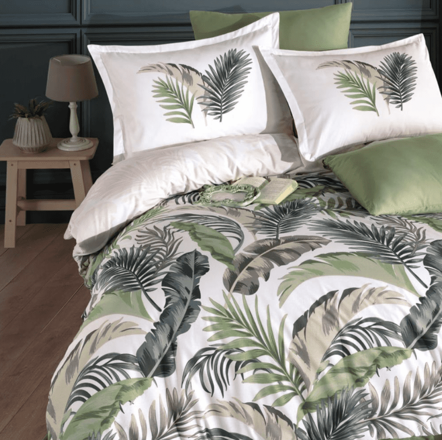 Комплектът е в бяла основа с големи тропически листа в зелено, маслено и сиво-бежови нюанси. Калъфките са с изчистен акцент – по два палмови листа в контрастни цветове, което подчертава свежата визия. Долният чаршаф е в едноцветно зелено за балансиран завършек.