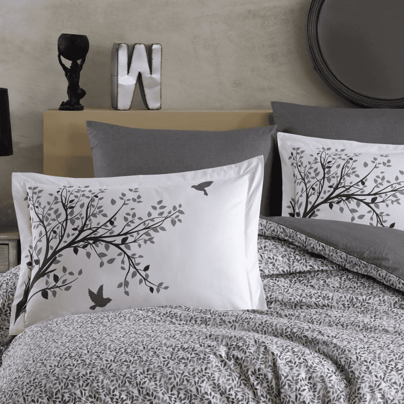 Двулицевият плик предлага възможност за лесна промяна на визията според настроението ви – от семпъл и изчистен стил до артистичен десен. Калъфките са с изящен мотив от клони и птици, които създават усещане за хармония с природата. Сивата основа в комбинация с бялото придава модерен и минималистичен вид, подходящ за всеки интериор.