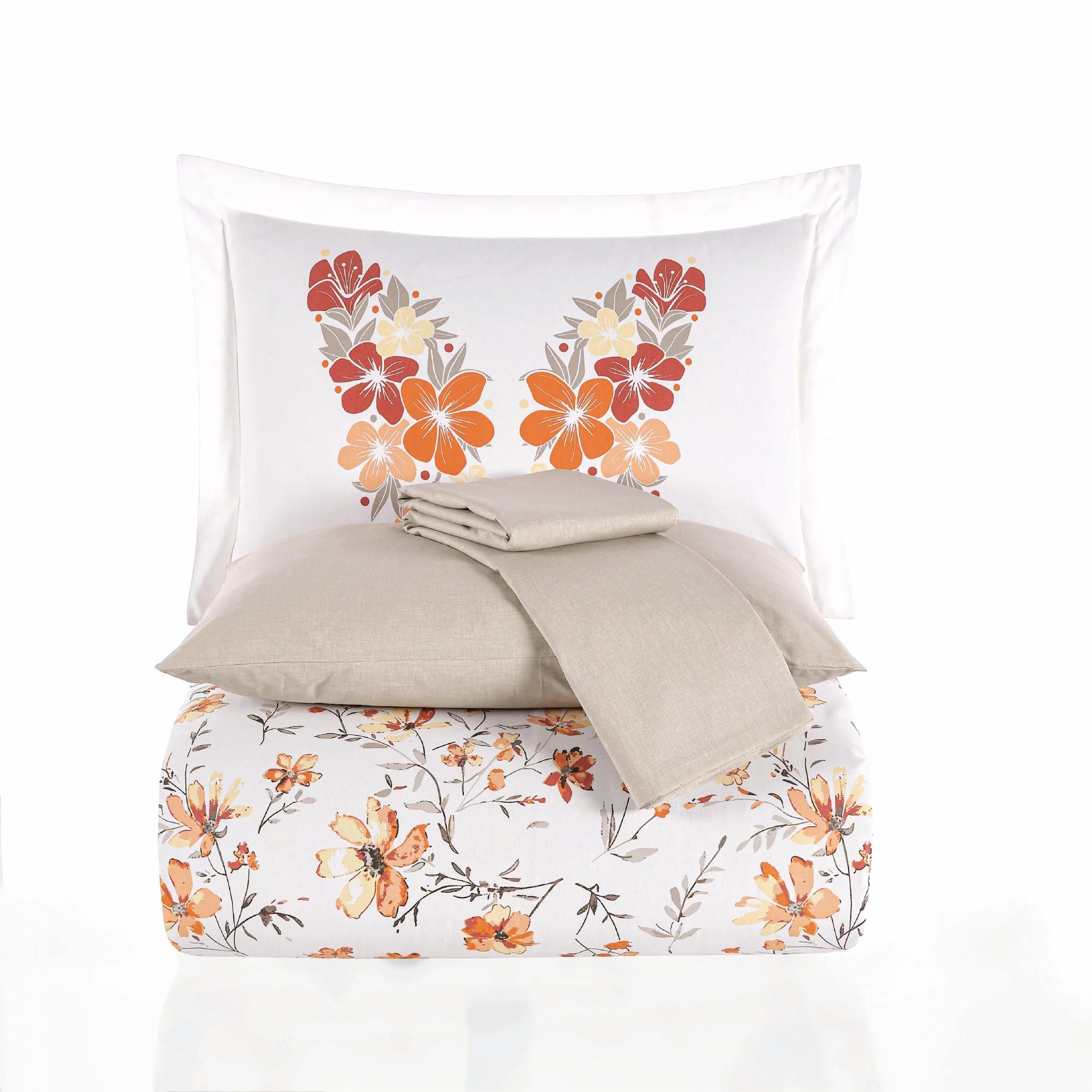 Спалният комплект Belis Oranj впечатлява с топъл, свеж и жизнерадостен дизайн, който внася уют и светлина в спалнята. Десенът е изграден върху чиста бяла основа, декорирана с нежни флорални мотиви в нюанси на оранжево, прасковено, керемидено и меко бежово. Цветята са фино разположени и създават усещане за лекота, естественост и спокойствие, без да натоварват пространството.