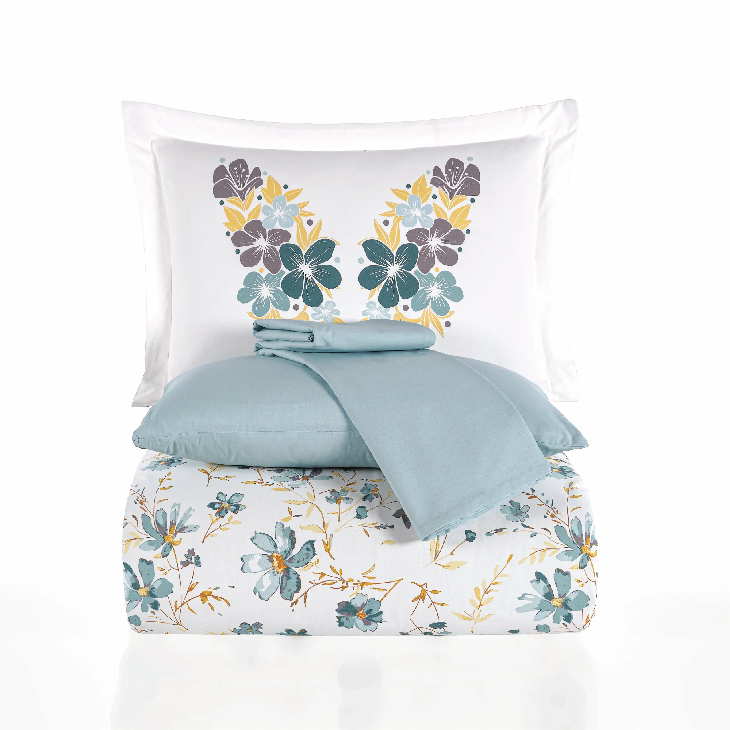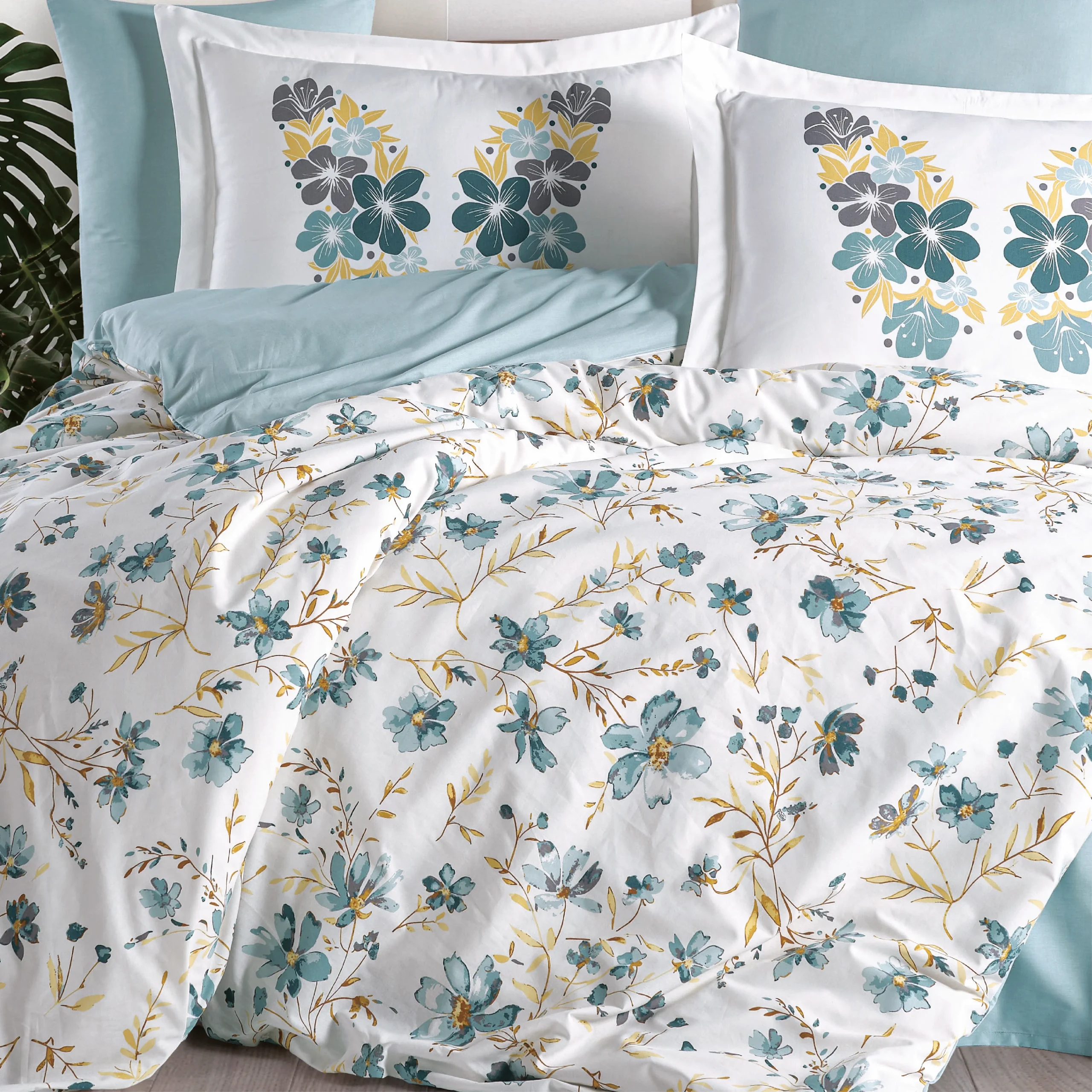 Долният чаршаф и пликът за завивка са с повтарящ се флорален десен, а едноцветните тюркоазени елементи допълват визията и подчертават свежия, модерен и хармоничен облик на модела.