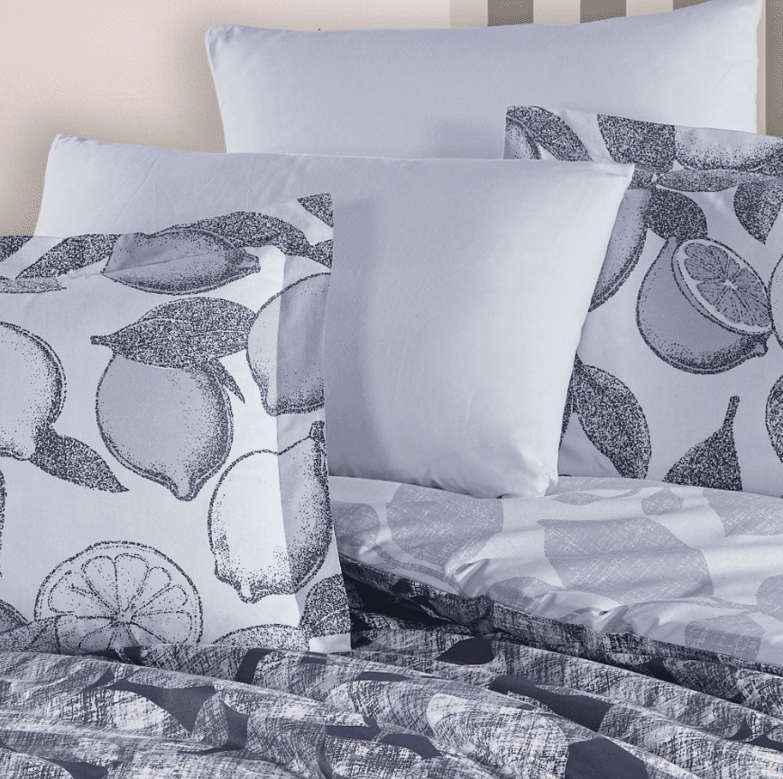 Спалният комплект Calisse – Lacivert впечатлява с артистичен десен, вдъхновен от природата – стилизирани листа и цитрусови форми в дълбоки мастилено-сини и студено-сиви тонове. Дизайнът съчетава модерна графика и натурални текстури, създавайки динамична, но едновременно уютна визия. Десенът е балансиран и носи усещане за свежест, лекота и подредена естетика в спалнята.