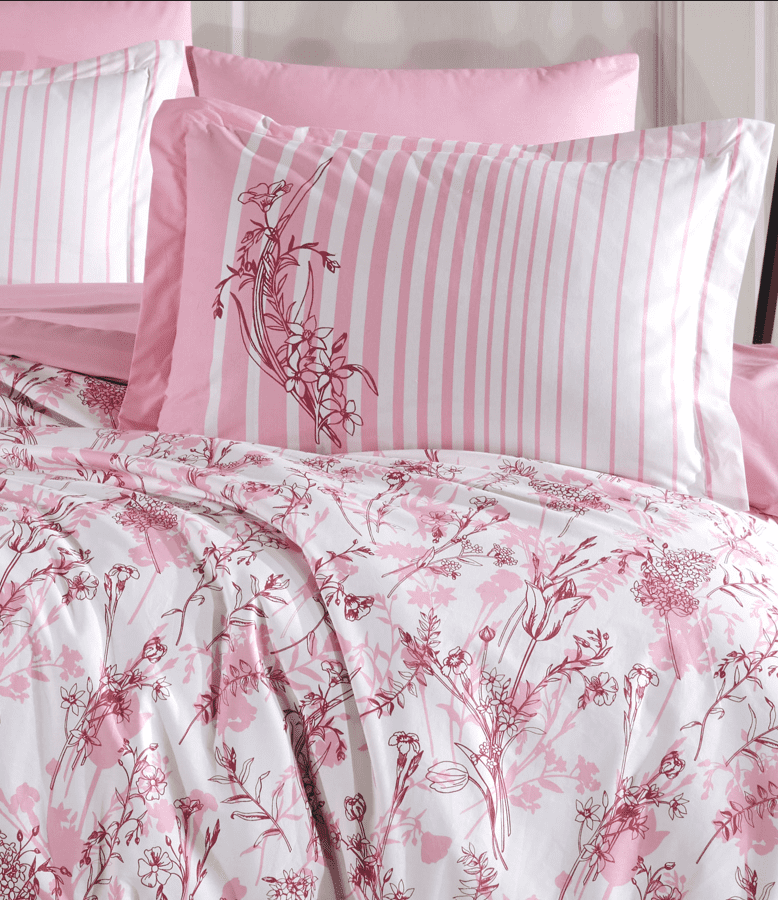 Спалният комплект Yakut впечатлява с нежни флорални мотиви и елегантни вертикални линии в мека розово-бяла палитра. Десенът съчетава фино изрисувани цветя, разпръснати върху снежнобяла основа, и калъфки с деликатни вертикални линии и акцентен флорален елемент. Комбинацията създава усещане за чистота, нежност и романтика в интериора.