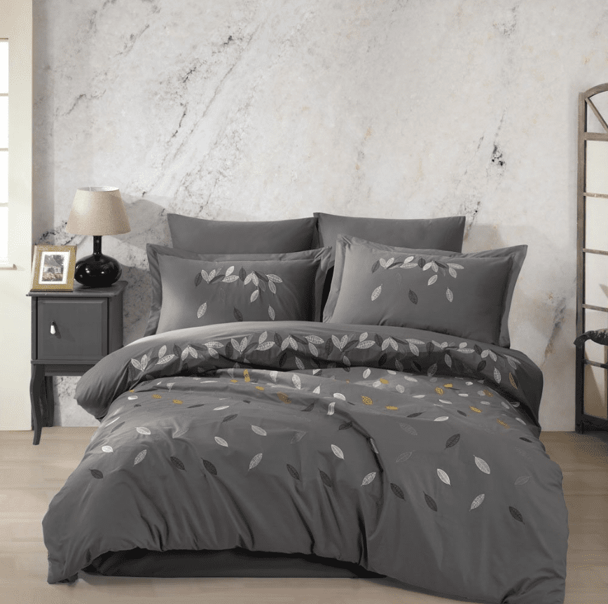 Деликатната бродерия от фини листа в сиво, бяло и златисто се откроява върху дълбок графитен фон, придавайки усещане за стил и уют. Изчистеният дизайн и класическата гама цветове го правят подходящ за модерни и минималистични интериори.