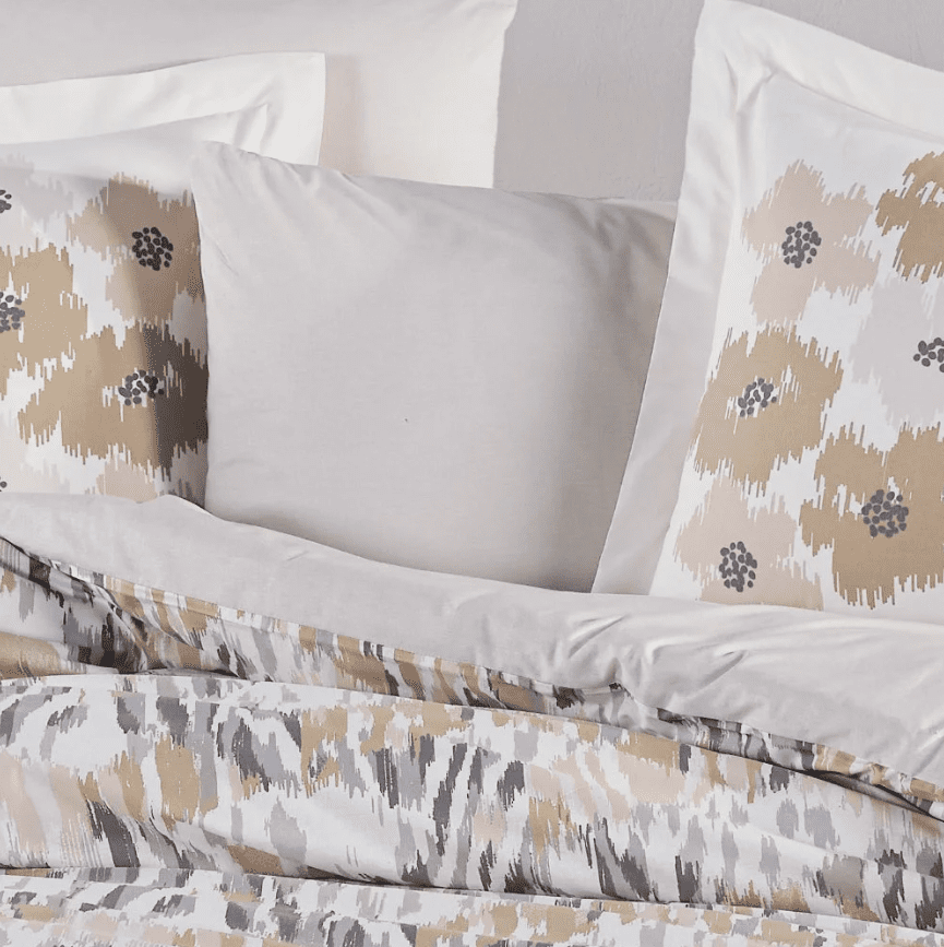 Спалният комплект Penny Taş впечатлява с модерен артистичен дизайн, който комбинира абстрактни мазки и стилизирани форми в спокойна палитра от бежово, сиво и крем. Десенът е изчистен, ефирен и носи усещане за мекота и хармония, благодарение на плавните преходи и леко „акварелната“ визия на мотивите.