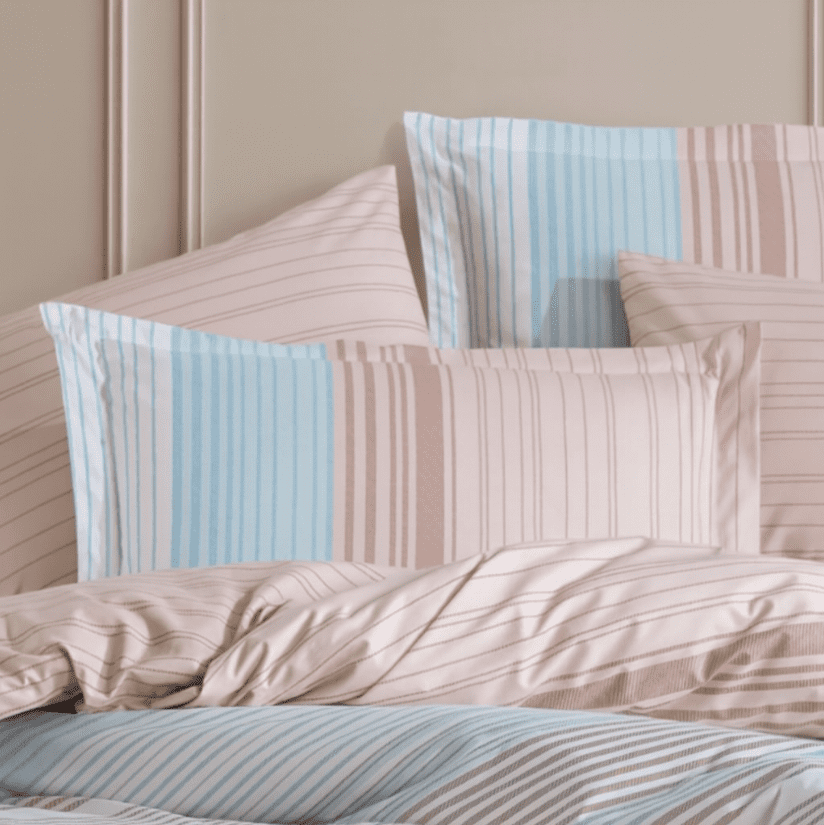 Този елегантен спален комплект от 100% памук поплин съчетава комфорт, стил и практичност в едно. Дизайнът е изчистен, но същевременно модерен – нежните ивици в бежово, синьо и розово придават свежест и усещане за простор в спалнята. Меките тонове лесно се вписват както в класически, така и в съвременни интериори.