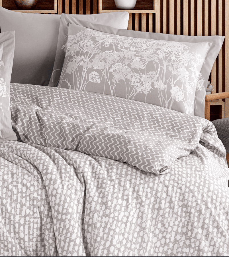Калъфките са красив акцент – върху тях са разположени фини силуети на полски цветя, нежно очертани върху светла основа. Те придават естествена мекота, светлина и стилно излъчване. Долният чаршаф в „taş“ нюанс завършва визията и създава усещане за цялост и хармония.
