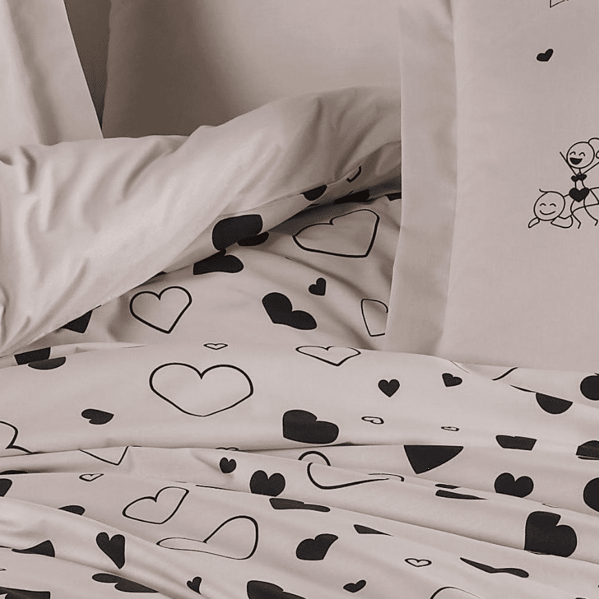 Калъфките са с допълнителен художествен акцент – симпатични илюстрирани мотиви на малки фигурки, които допринасят за усещането за топлина, любов и игривост. Те придават завършеност на комплекта и го превръщат в чудесен избор за всяка спалня, която търси нотка романтика и индивидуален характер.