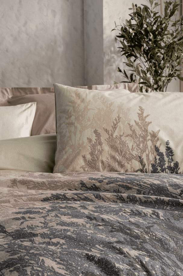 Този елегантен комплект внася усещане за спокойствие и природна хармония в спалнята. Основата е в меки бежови и пясъчни тонове, преминаващи плавно към по-дълбоки кафяво-сиви нюанси. Десенът наподобява силуети на горска растителност, придавайки дълбочина и естественост на визията.