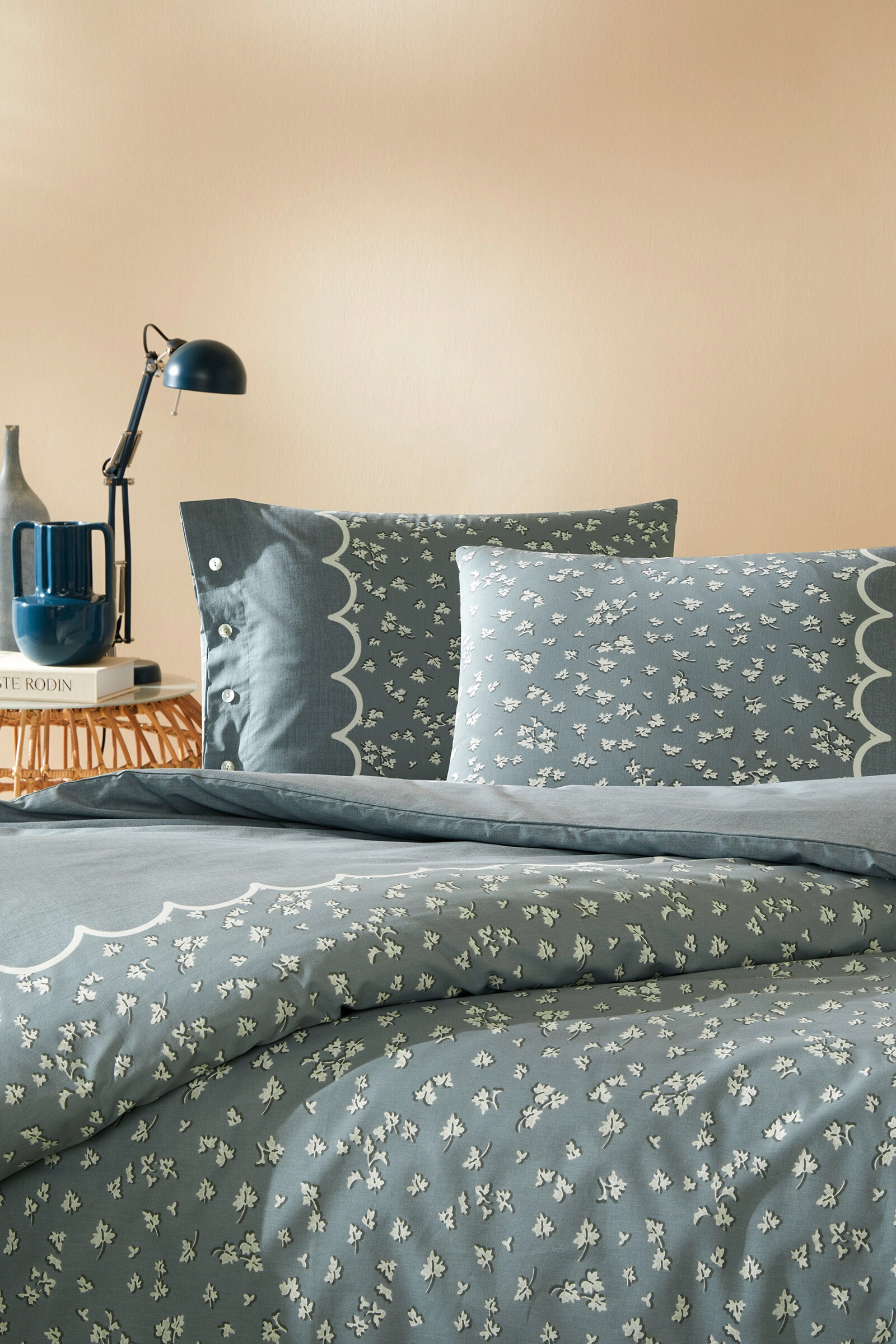 Десенът съчетава приглушено синьо-зелено в два нюанса и нежни бели флорални мотиви, разпръснати като фина ботаническа рисунка