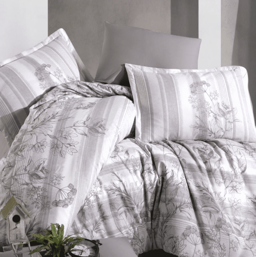 Комплектът е в светло сива основа с преливащи вертикални ивици в различни нюанси на сивото. Върху тях са разположени фини флорални линии в тъмен графитен тон, които придават елегантна и изчистена визия. Долната част е в едноцветно сиво за завършен контраст.