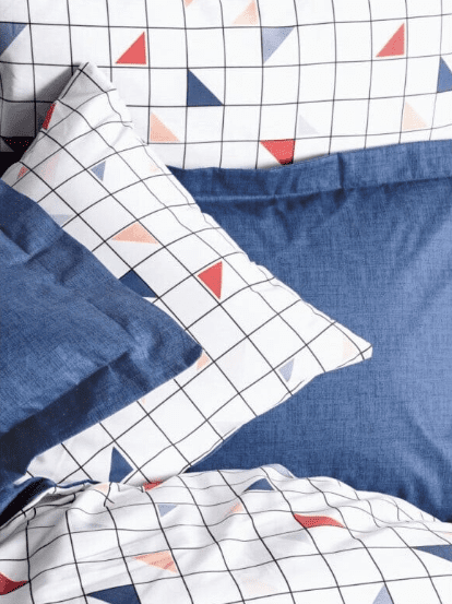 Основата е в бяло с изчистена решетка от черни линии, върху която са разположени малки триъгълници в червено, синьо и бежово. Контрастът със семплите едноцветни калъфки и чаршаф в наситено синьо създава свежо и балансирано излъчване.