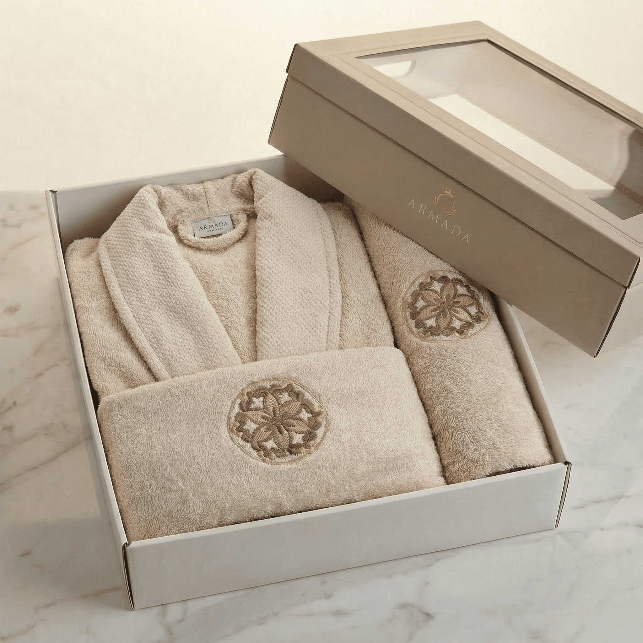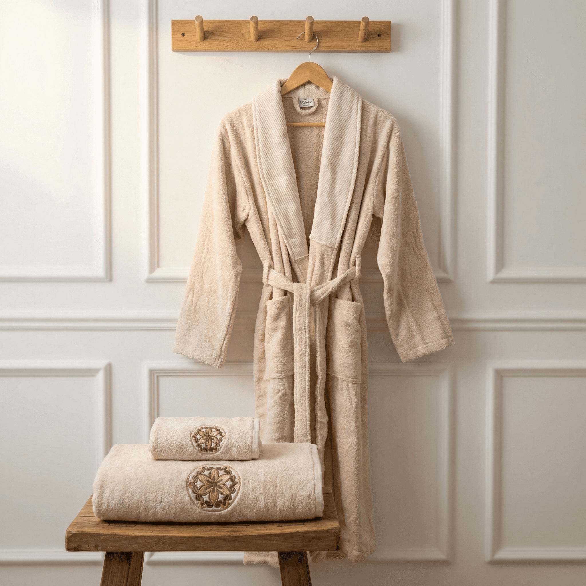 Изискан комплект за баня, създаден както за мъже, така и за жени, който съчетава комфорт, стил и функционалност в едно. Нежният бежов цвят и елегантната бродерия придават усещане за спокойствие и лукс във всяка баня.