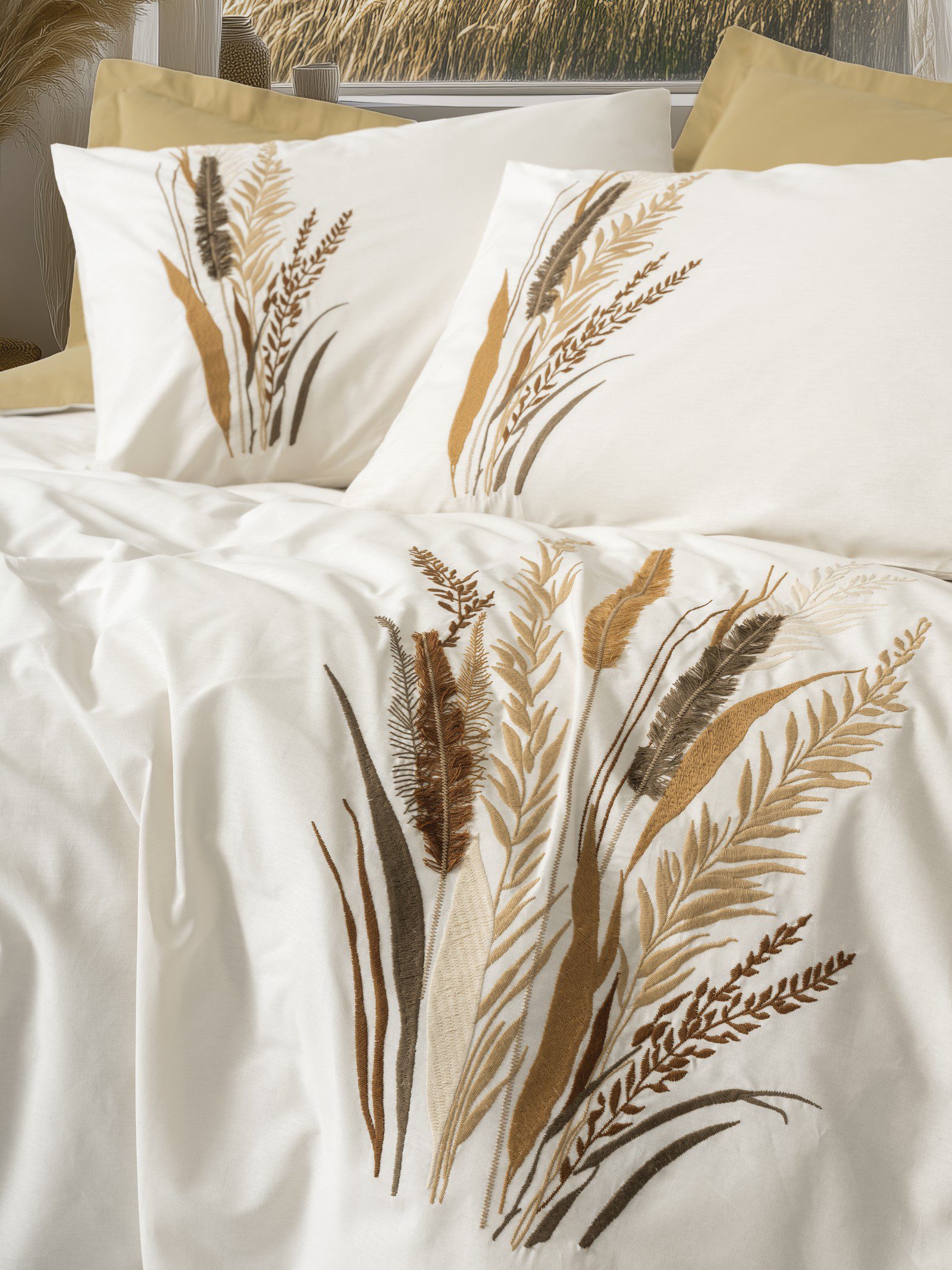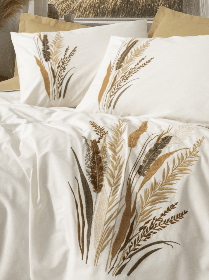 Основата в нежен ванилово-кремав цвят е украсена с прецизна бродерия на житни класове и полски треви в топли нюанси на златисто, карамелено, кехлибарено и кафяво. Всеки детайл е вдъхновен от природата – фин, деликатен и изпълнен с живот.