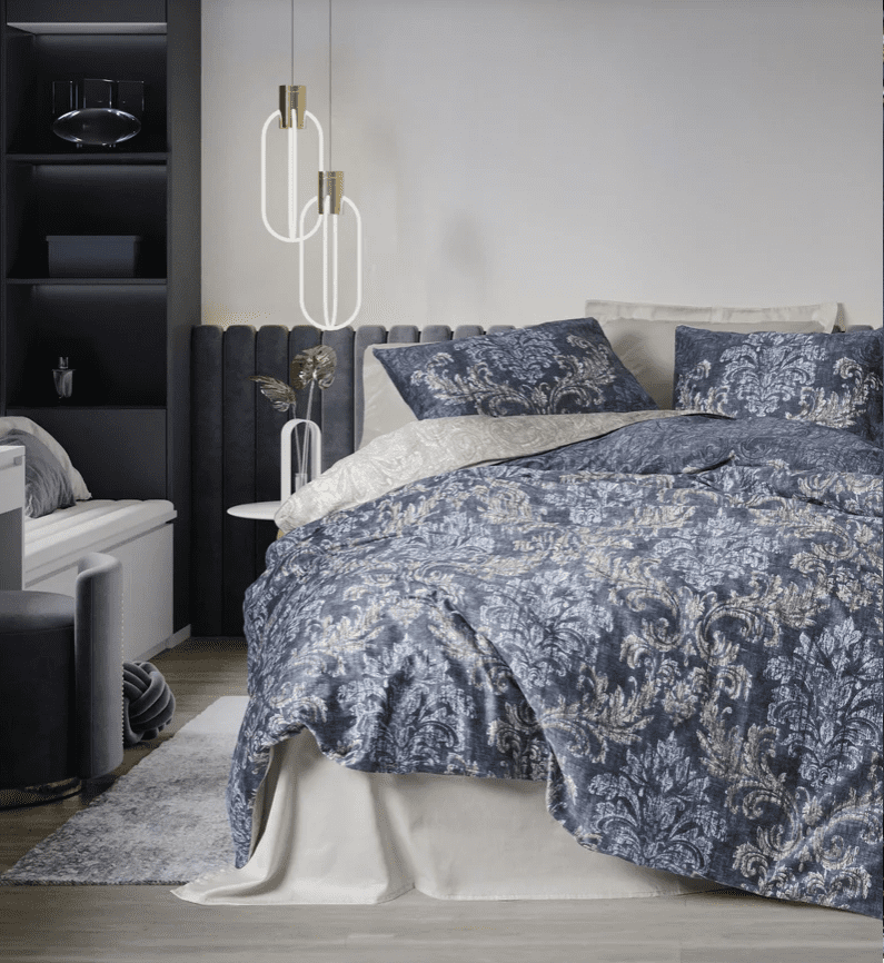 Изисканият стоманено син тон, съчетан с богат орнаментален десен, създава усещане за дълбочина, спокойствие и фина луксозна атмосфера.