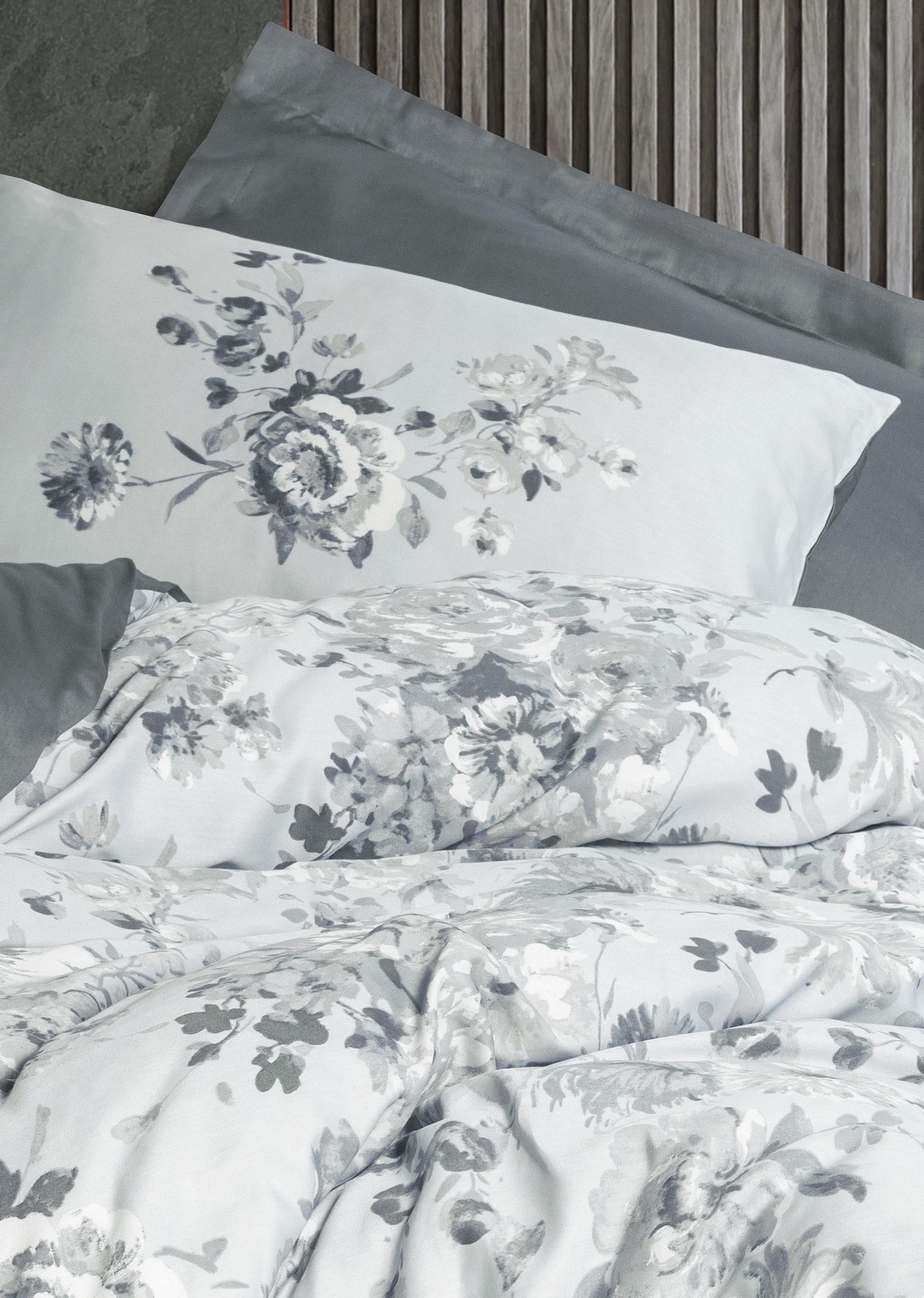 Елегантен модел, вдъхновен от изяществото на класическите флорални мотиви. Десенът е в меки нюанси на сиво, преливащи се върху снежнобяла основа, което придава изчистена и стилна визия. Дизайнът съчетава нежност и модерна изтънченост – идеален избор за хора, които ценят минимализма и хармонията в спалнята си.