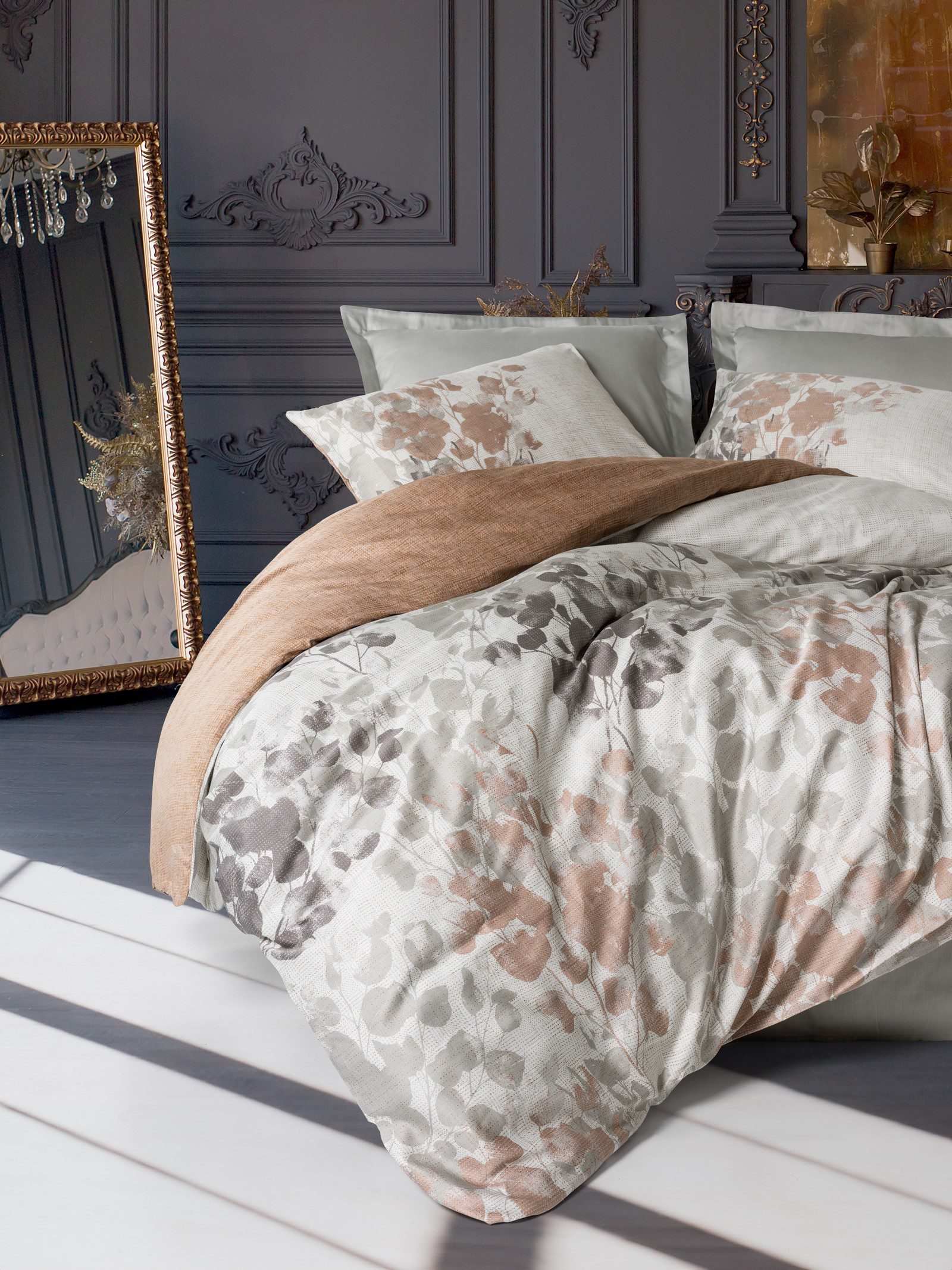 Cottonbox Saten Blatt Gri Луксозно спално бельо – 6 части – за спалня