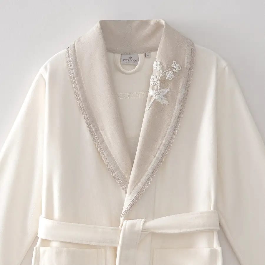 Дамският халат е с ленена яка, декорирана с ръчна бродерия и фина дантела (kopanaki), което придава деликатна женственост и изисканост.