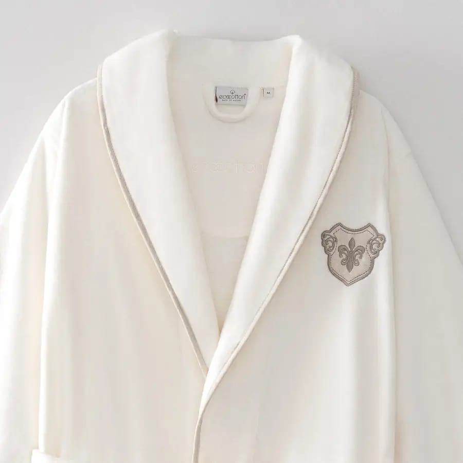 Мъжкият халат е с елегантна емблема (арма) и ленени кантове, които подчертават класическия и стилен дизайн.