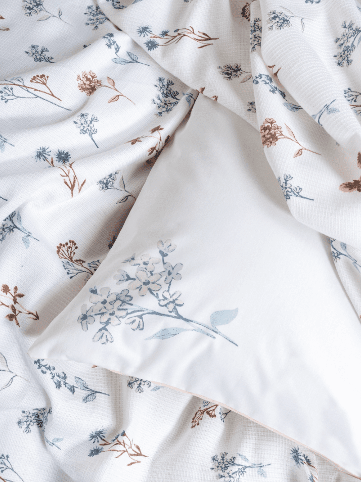 Калъфката е с по-голям централен флорален мотив, който създава нежно визуално равновесие. Дизайнът е отличен избор за интериори с бохо, натурална или сканди естетика, като внася усещане за топлина, лекота и стилна хармония.