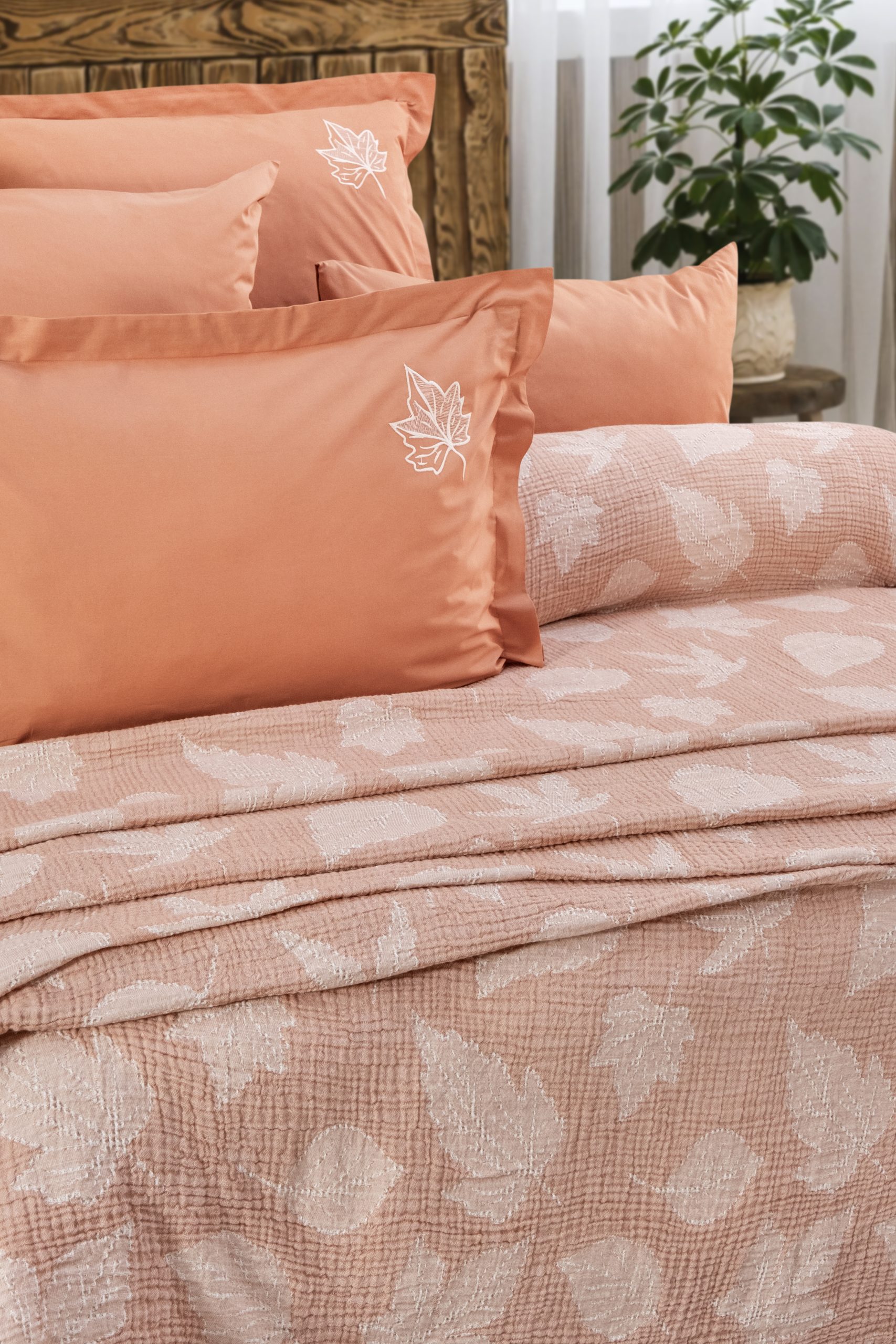 Цвят и усещане: Топъл коралов нюанс с фина бродерия на листо в млечно бяло, комбиниран с муселиново покривало в нежно релефен флорален мотив. Тази комбинация създава усещане за природен уют и слънчева хармония.