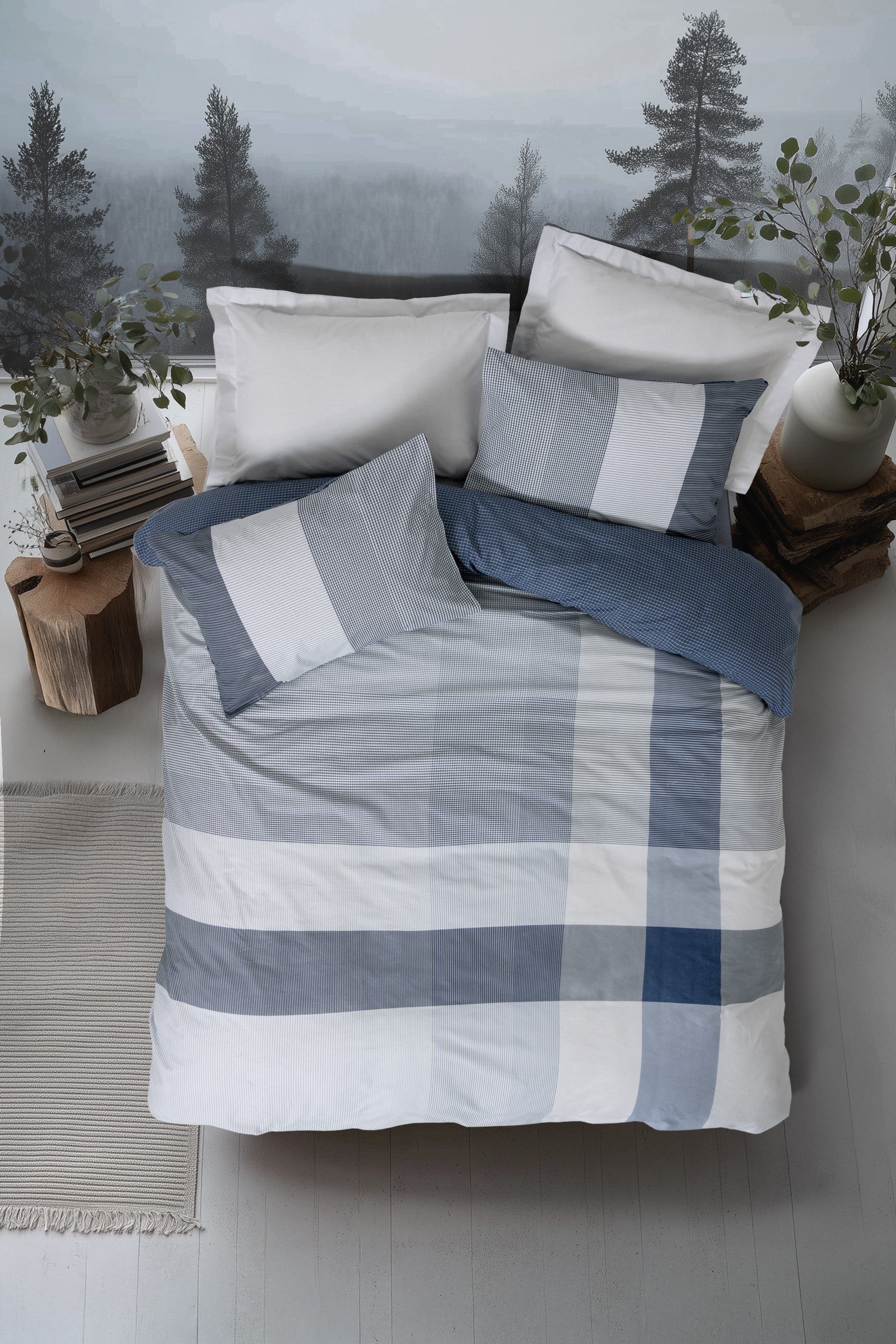 „Liva Blue“ съчетава естествен уют и модерен минимализъм. Десенът с широки карета в различни нюанси на синьото и сивото носи усещане за свежест, спокойствие и чистота. Идеален избор за хора, които предпочитат семпъл, но елегантен стил в интериора. ?