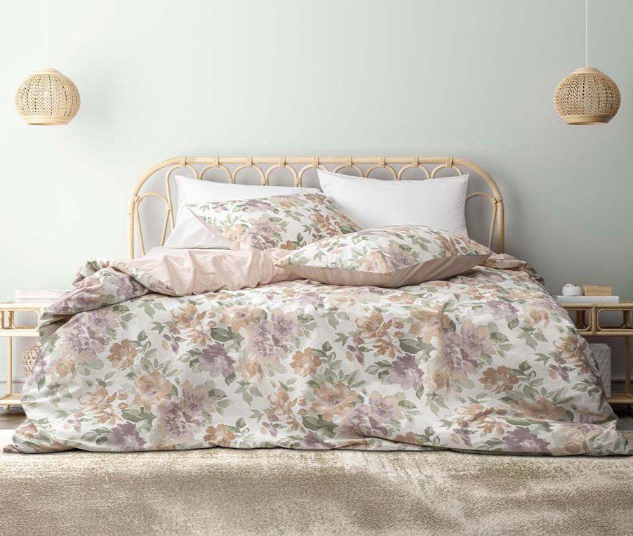 Комплектът е в мека гама от бежово, пудрено розово, лавандула и приглушено зелено. Цветята са фино разпръснати върху светла основа, създавайки ефект на ефирна градина.