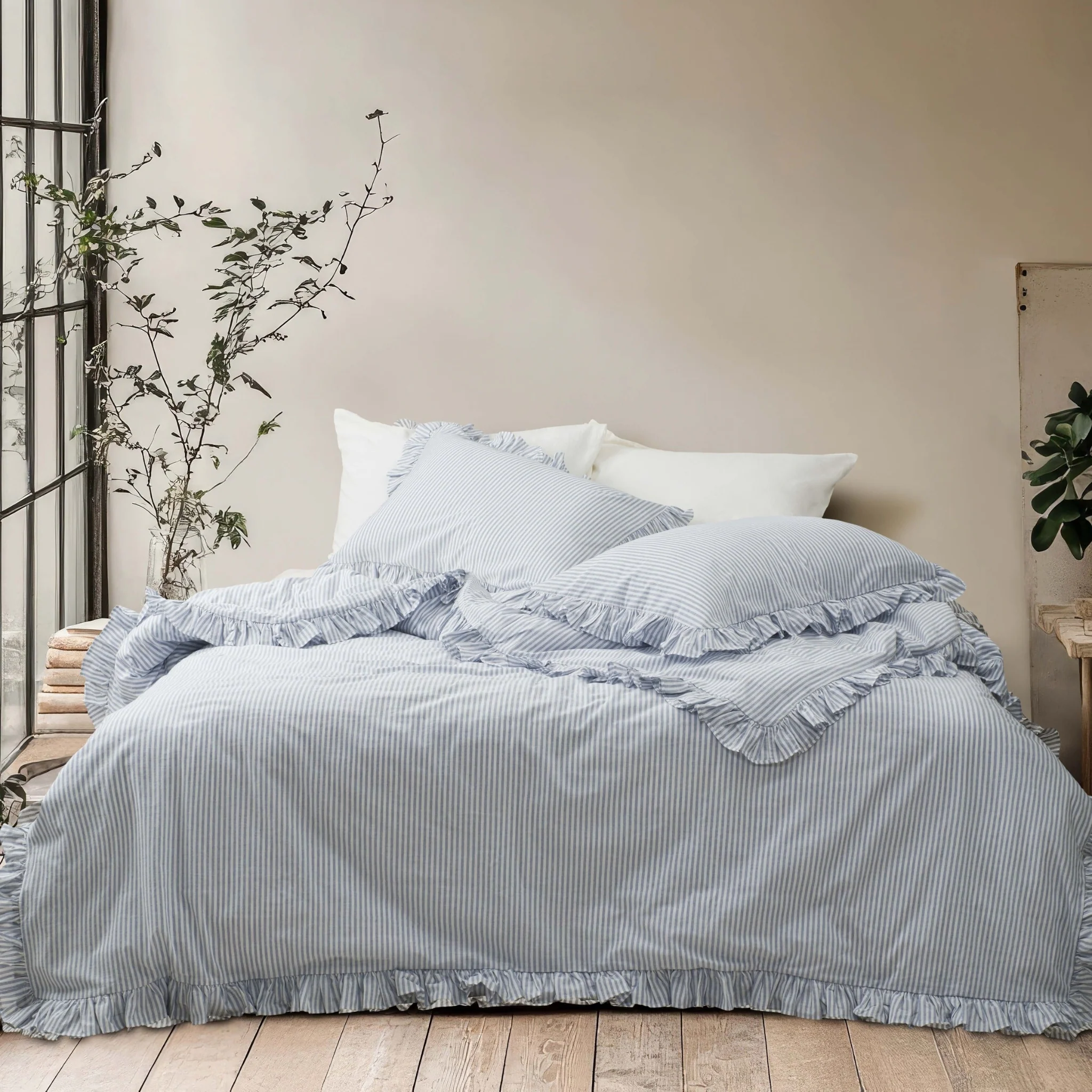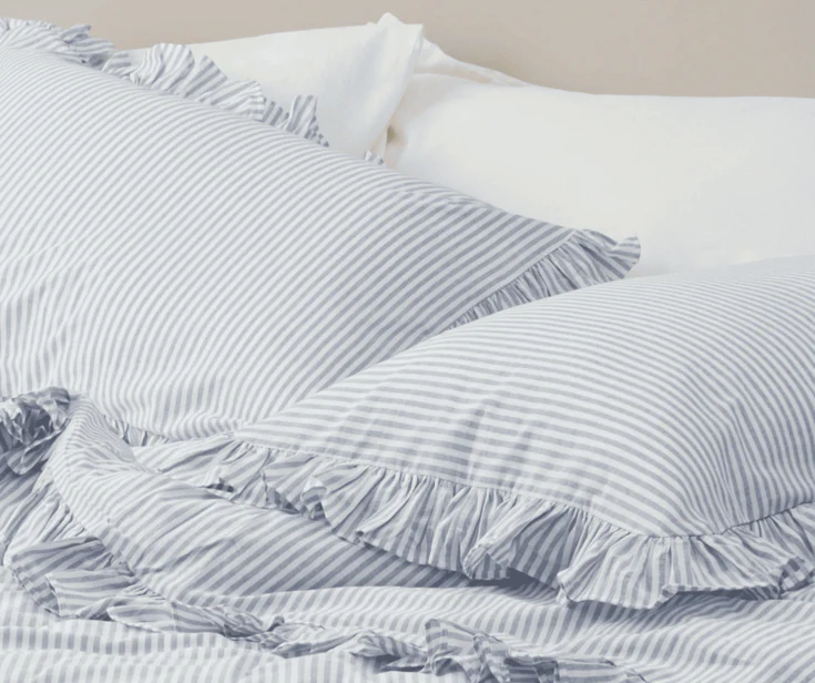 Комбинацията от фини райета и нежни волани създава балансиран микс между класика и модерна визия. Леката текстура и меките линии придават уют и женственост, без да натоварват интериора.