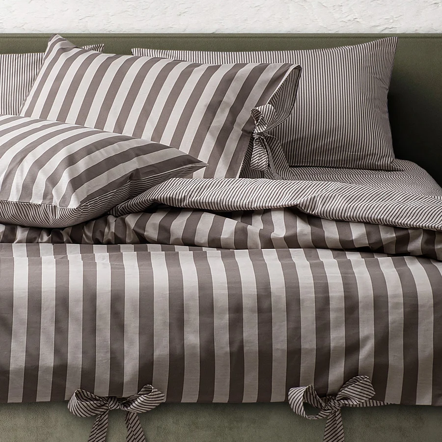 Елегантният райе десен в топли нюанси на таупе (бежово-кафяво) и мек крем създава изключително хармонична и уютна визия. Цветовата комбинация е по-мека и натурална, което придава спокойствие, топлина и усещане за домашен комфорт.