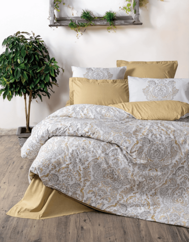 „Najva“ е символ на изисканост и топлина. Десенът впечатлява с класически барокови орнаменти в златисто и сребристо върху нежна бяла основа, съчетани с контрастни елементи в мека горчична тоналност. Тази комбинация придава на спалнята луксозно, но уютно излъчване, което ще ви накара да се отпуснете и насладите на истински комфорт.