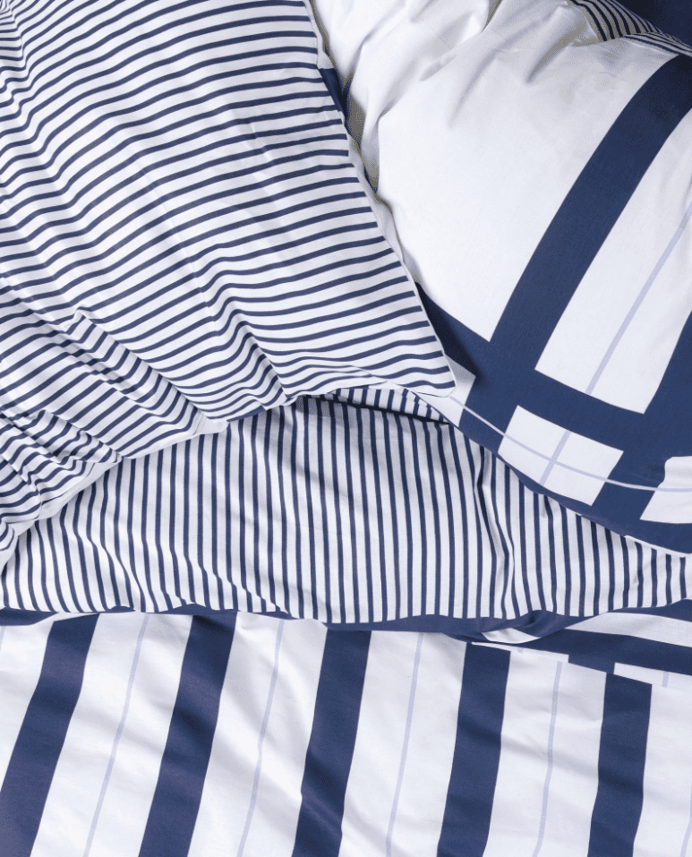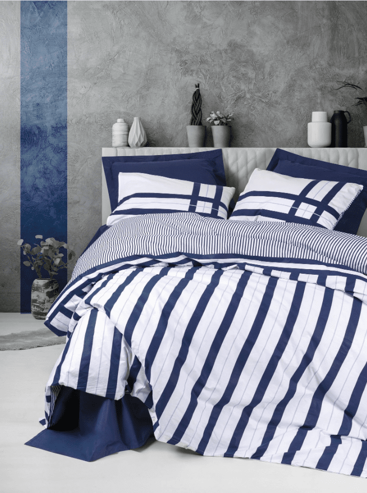 „Nifty“ съчетава свежестта на морския стил с модерна градска енергия. Изчистеният десен с вертикални и хоризонтални линии в тъмносиньо и бяло внася усещане за ред, простор и чистота в спалнята. Идеален избор за тези, които обичат минимализма, но търсят динамика в детайла.