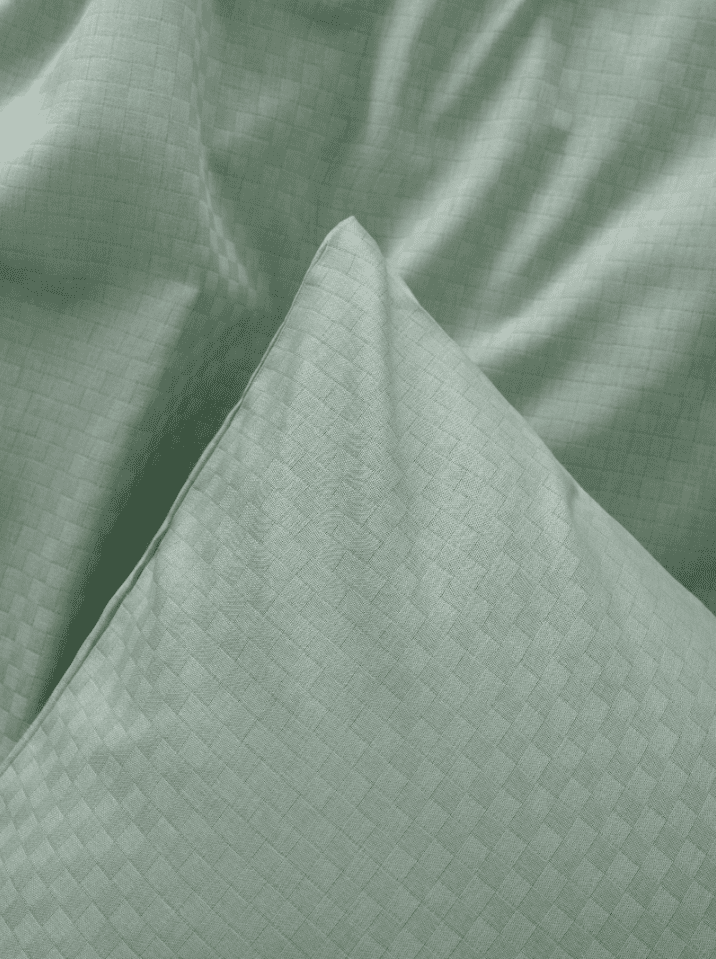Спалният комплект впечатлява с изчистен, модерен и изключително нежен дизайн в мек градинско-салвиев нюанс. Цветът е пастелен, спокоен и носи усещане за естествена хармония, свежест и уют. Семплият геометричен жакардов ефект придава фин характер на материята, без да натоварва визията — идеален избор за почитателите на стилната, минималистична естетика.